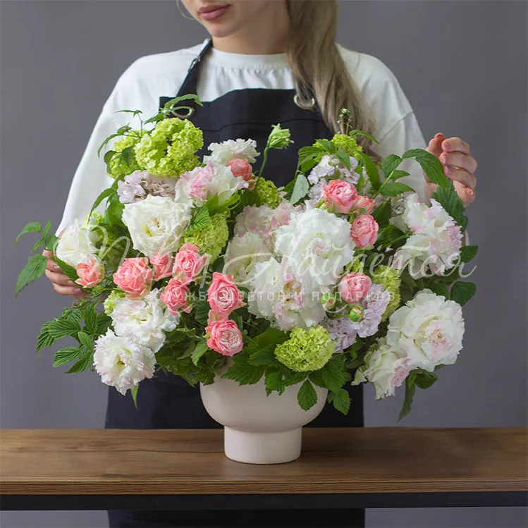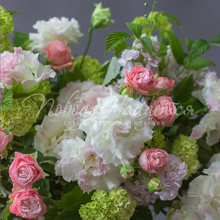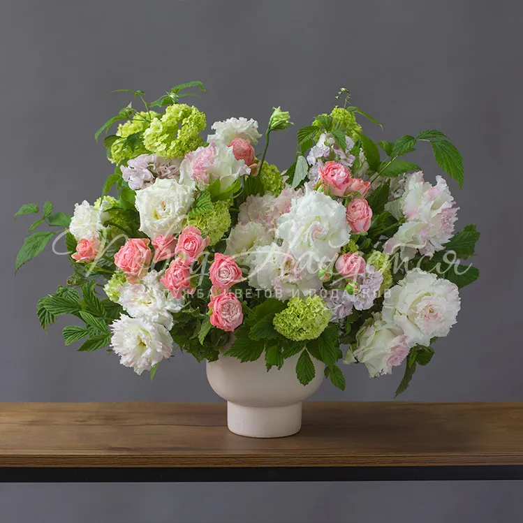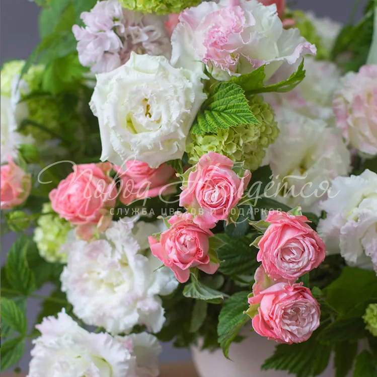 Состав: роза бомбастик 4 шт, вибурнум зеленый 4 шт, маттиола розовая 5 шт, эустома алиса белая 7 шт, малина зелень 0.3