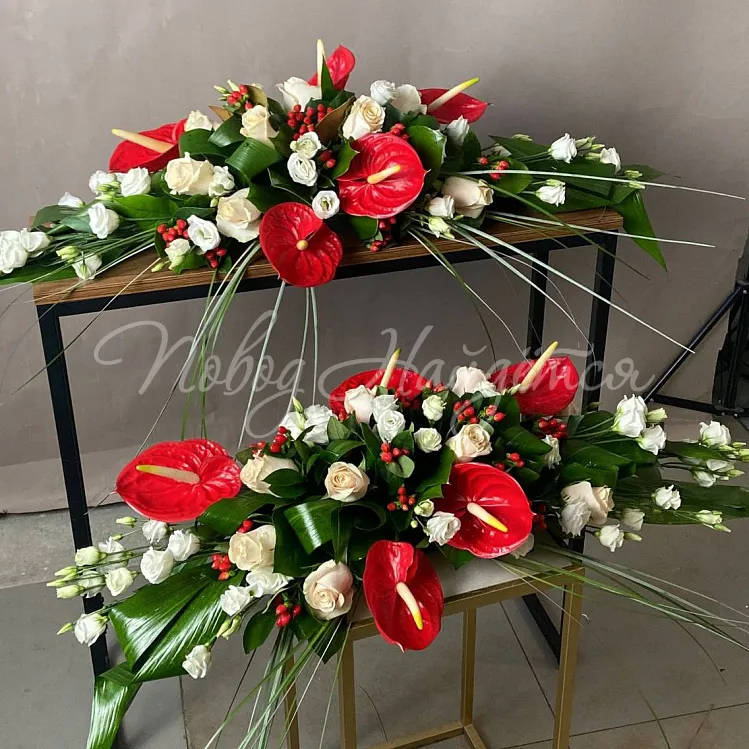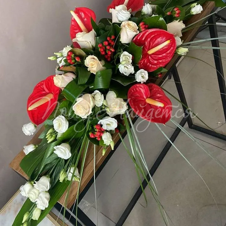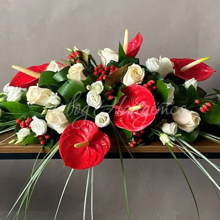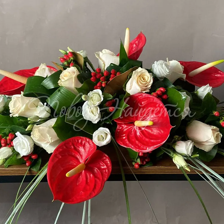 Состав: антуриум красный 5шт, роза кремовая талея 9шт, гиперикум красный 7шт, эустома лизиантус белый 7шт, аспидистра 7шт, салал 1/2, берграсс 1/2