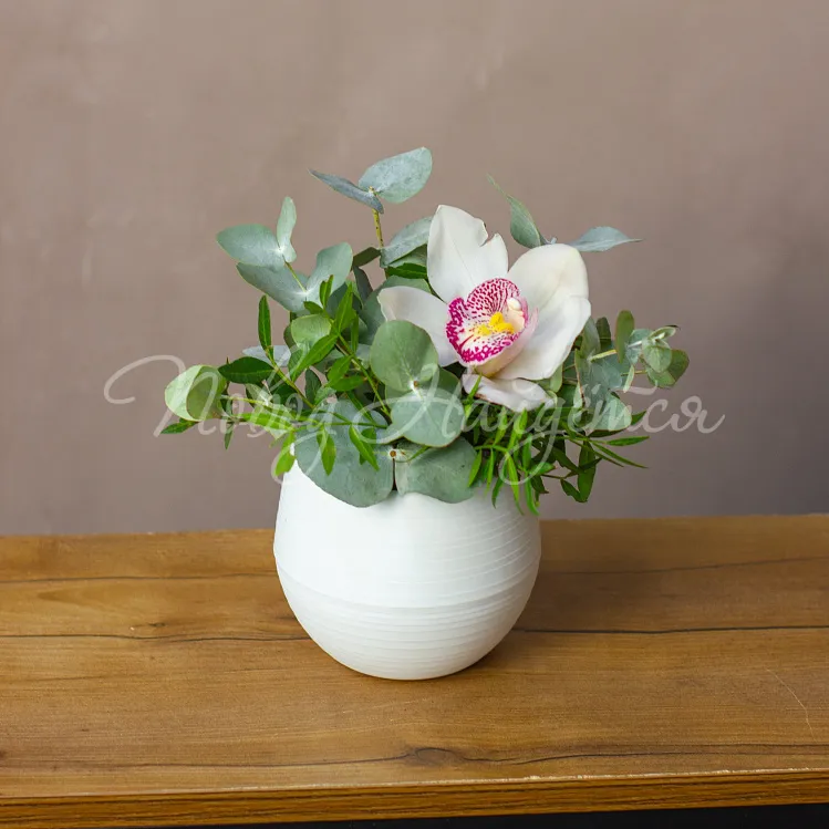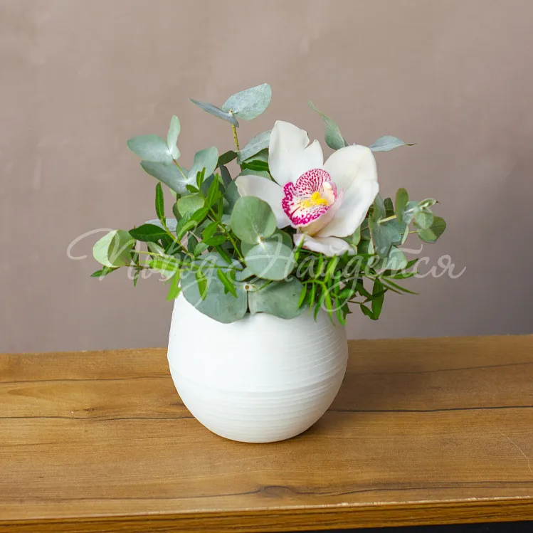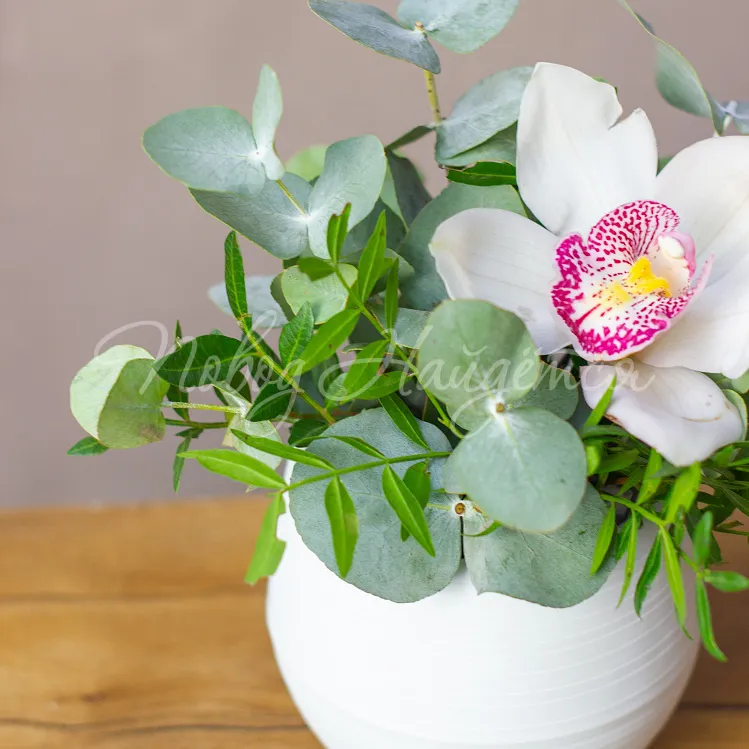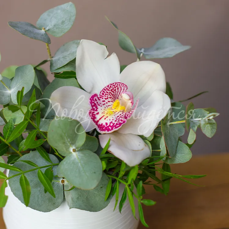 Состав :орхидея белая цимбидиум 1шт, писташ, эвкалипт цинарея.