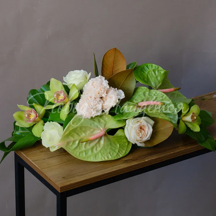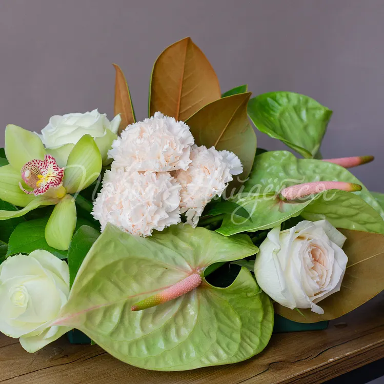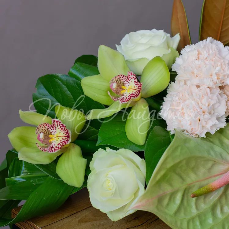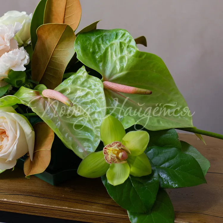 Состав: антриум зеленый 3шт, орхидея цимбидиум зеленый 4шт, роза пионовидная вайт о хара 4шт, диантус кремовый 3шт, магнолия 1шт, салал 1/2, аспидистра 4шт.