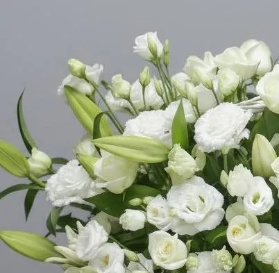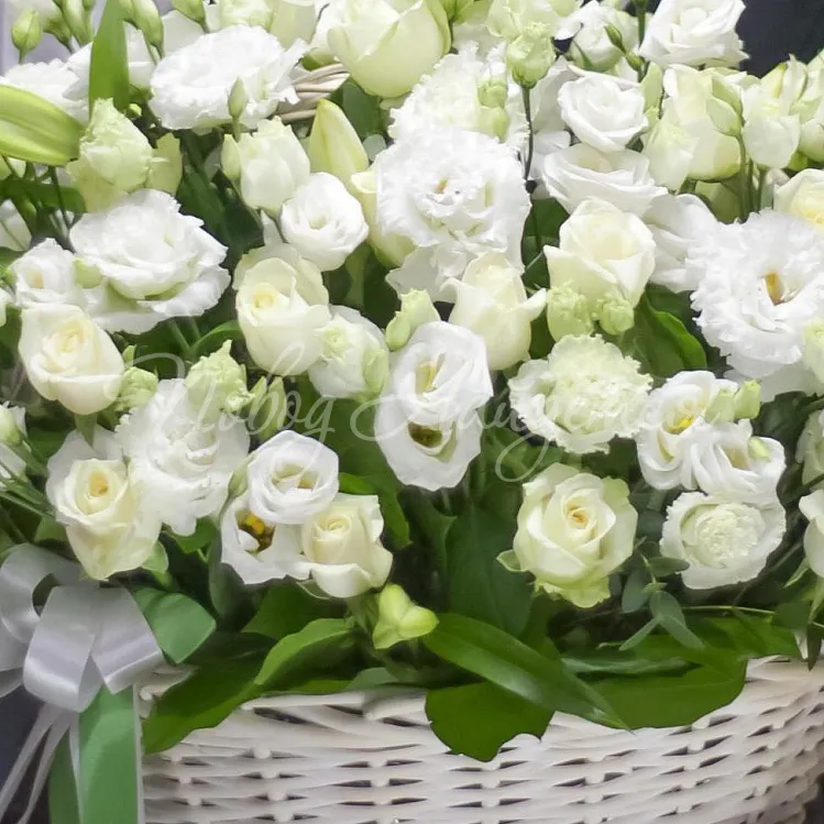 Состав: лилия белая- 3, эустомая белая - 4шт, алиса белая 4шт, салал 3/4, роза белая 50 - 35 шт, биофлора -3шт.