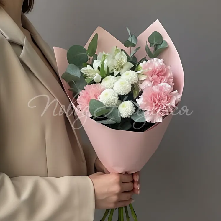 Состав: сантини белая - 1 шт., эвкалипт - 5 шт., гвоздика розовая одноголовая - 3 шт., альстромерия белая - 1 шт.