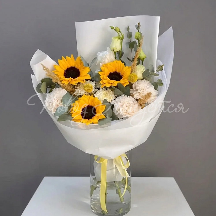 Состав: подсолнух 3шт, алиса эустома белая 1шт, диантус кремовый 6шт, эвкалипт, сухоцвет.