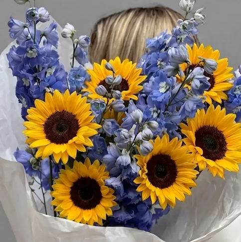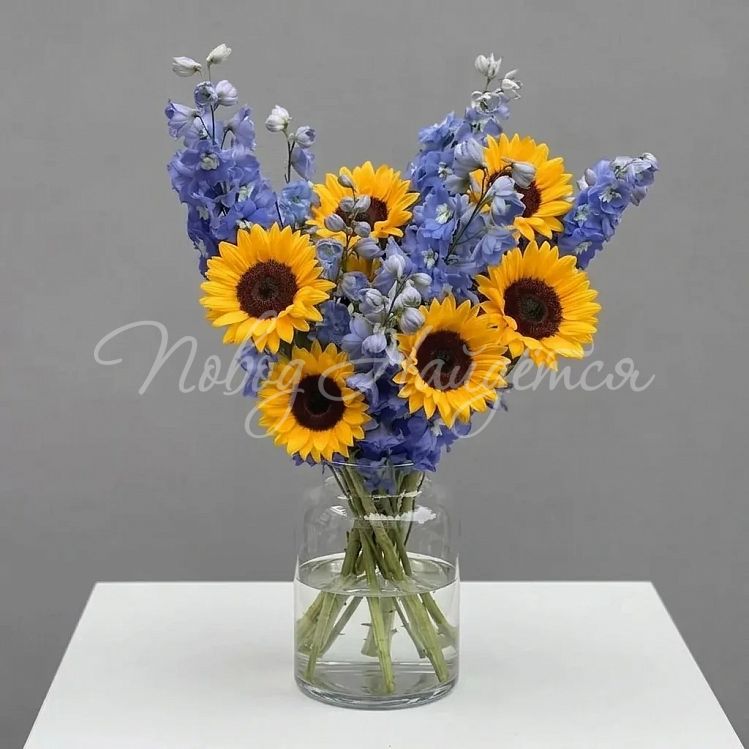 Состав: дельфиниум синий 8 шт, подсолнух 7 шт.