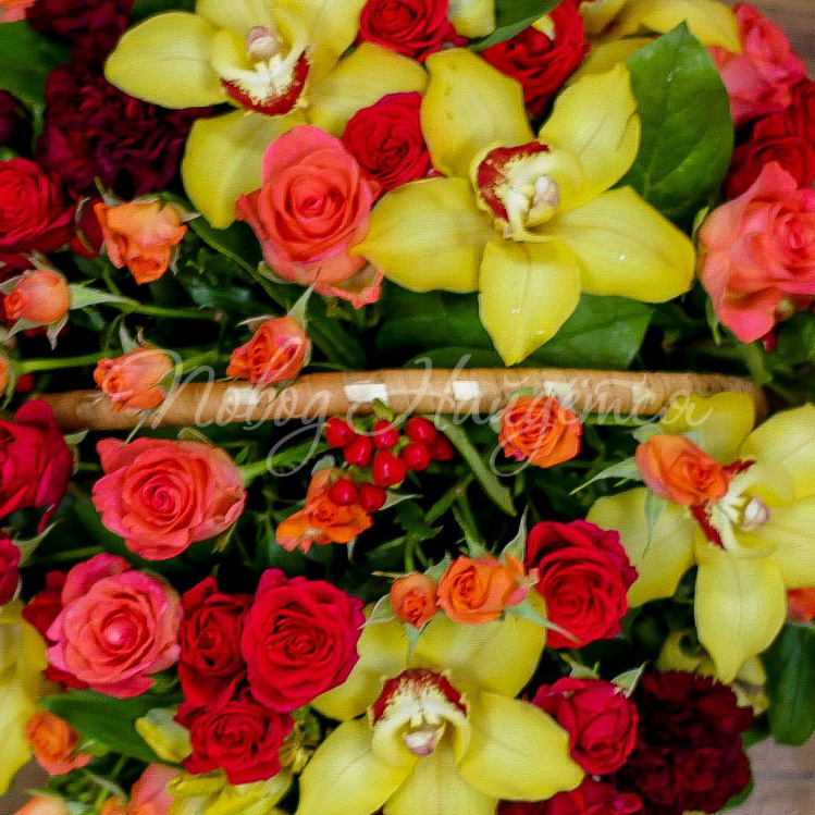 Состав: кустовая оранжевая роза 50 см - 5шт, кустовая красная роза 50 см - 6шт, альстромерия желтая 5шт, роза оранжевая вау 50 см - 8шт, диантус бордовый 5 шт,гиперикум красный 6 шт, цимбидиум желтый 7шт, салал, оазис.
