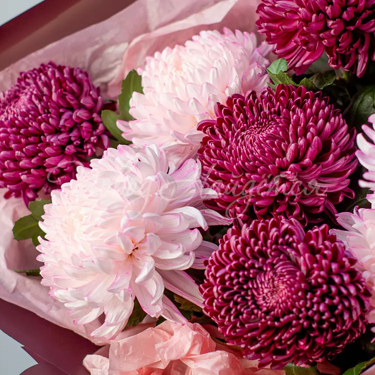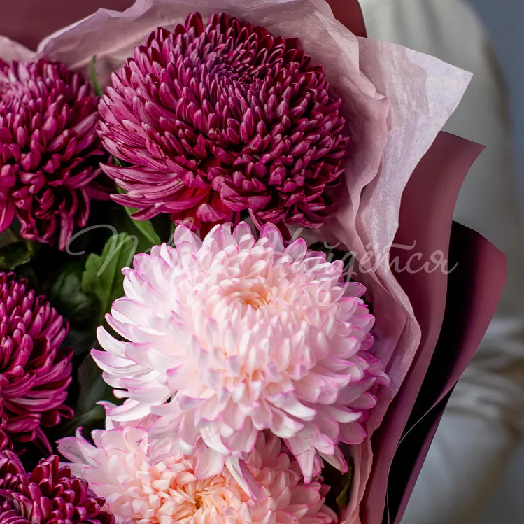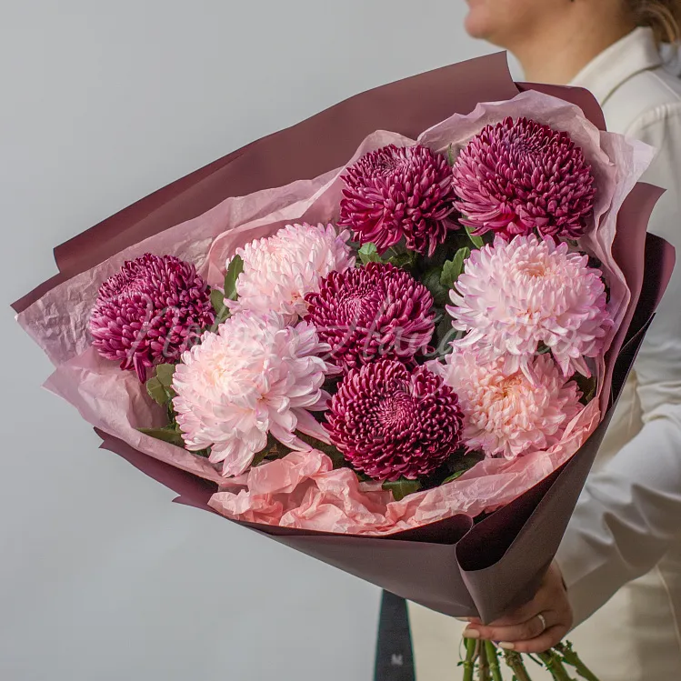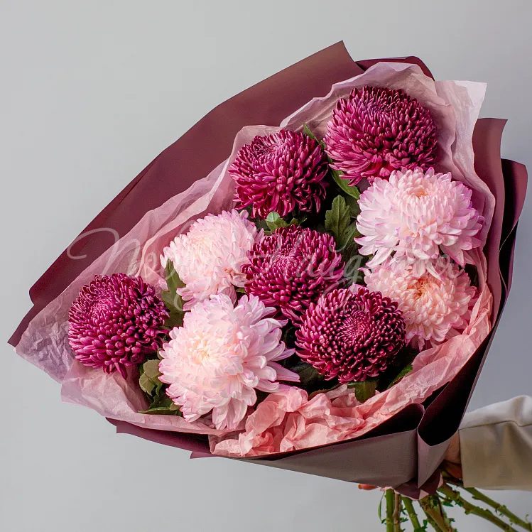 Состав: хризантема розовая одноголовая 4шт, хризантема винная 5шт, писташ.