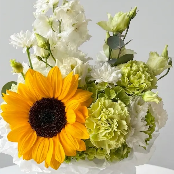Состав: подсолнух 1 шт, диантус зеленый одноголовый 5 шт, эустома белая 1 шт, маттиола белая кустовая 2шт, гортензия белая 1 шт, хризантема евро белая 1 шт., эвкалипт.