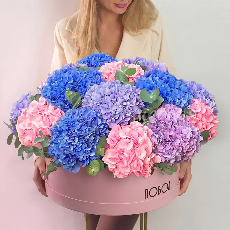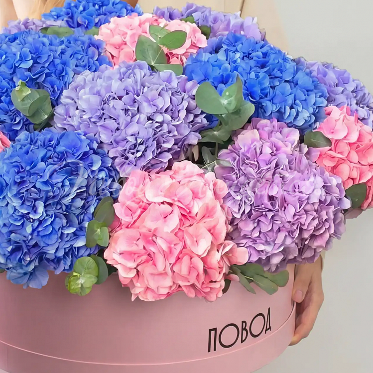 Состав: гортензия розовая 6 шт, гортензия синяя 6 шт, гортензия лавандовая 7 шт, эвкалипт 3 шт