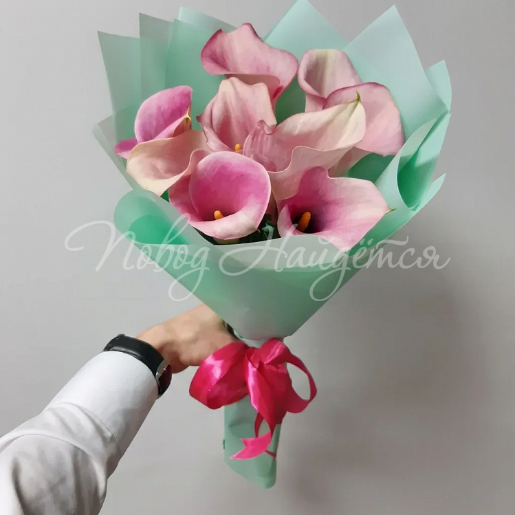 Упаковка: дизайнерская пленка цвета тиффани, лента малиновая.
