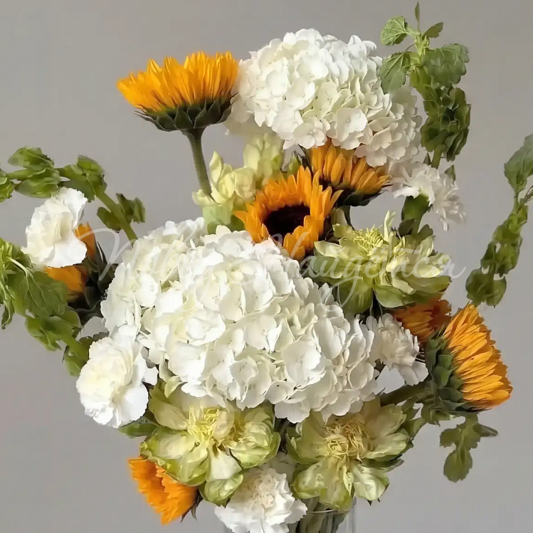 Состав: подсолнух 7шт, гортензия белая 2шт, диантус белый 6шт, малюцелла 5шт, роза вегги 6шт.