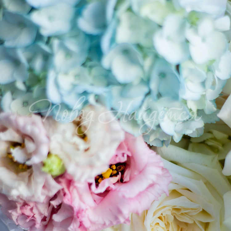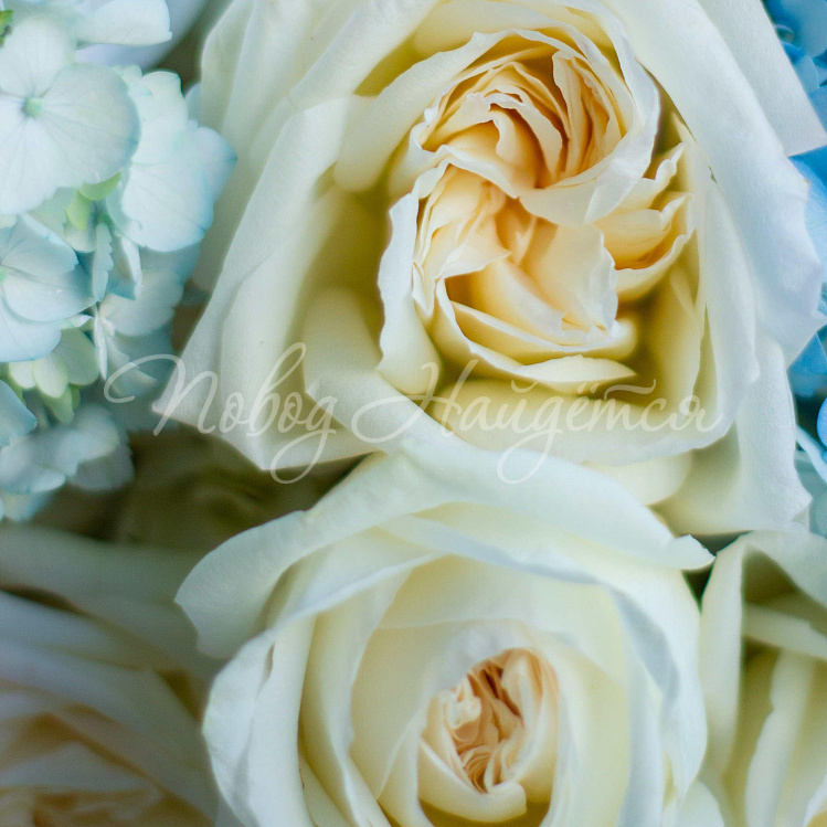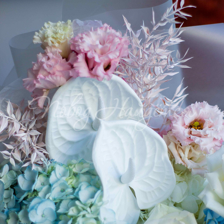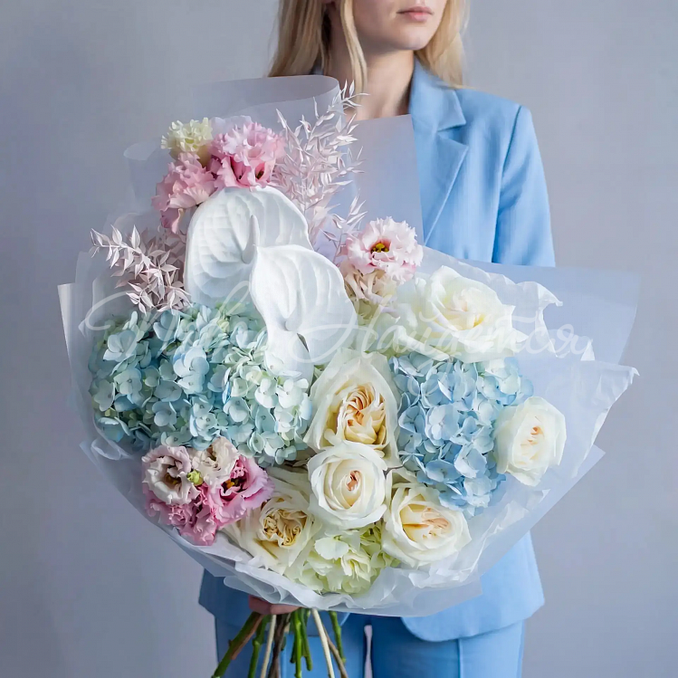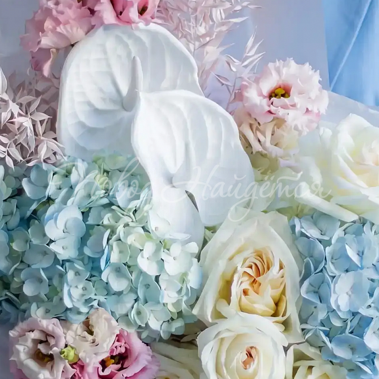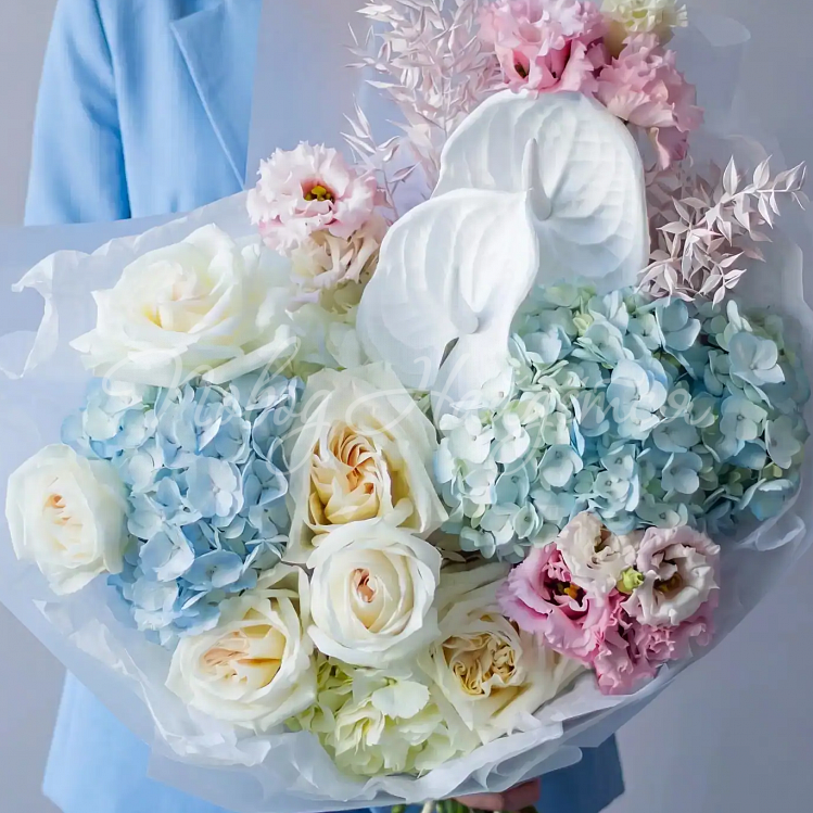 Состав: гортензия голубая 2шт, гортензия белая 2шт, антуриум белый 2 шт, роза пионовидная вайт о хара 6шт, алиса розовая 3шт, сухоцвет рускус стабилизированный нежно розовый, писташ.