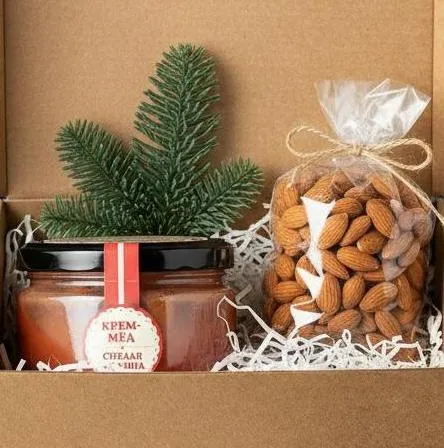 Состав: крем-мед 1 шт, миндаль 100 гр в пакете, лапник, шары золотые 2 шт.