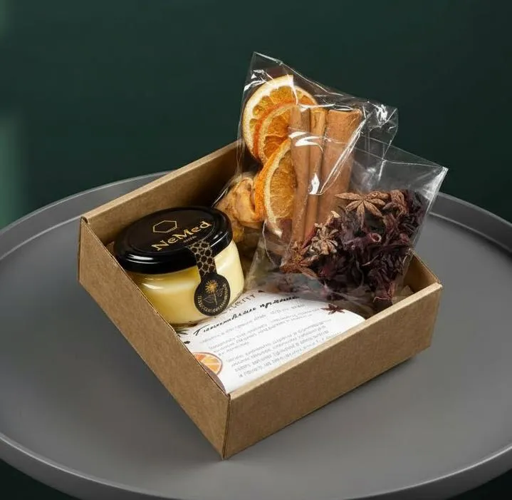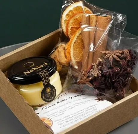 Состав: набор для глинтвейна, мед суфле 150гр, чай в ассортименте 60гр.