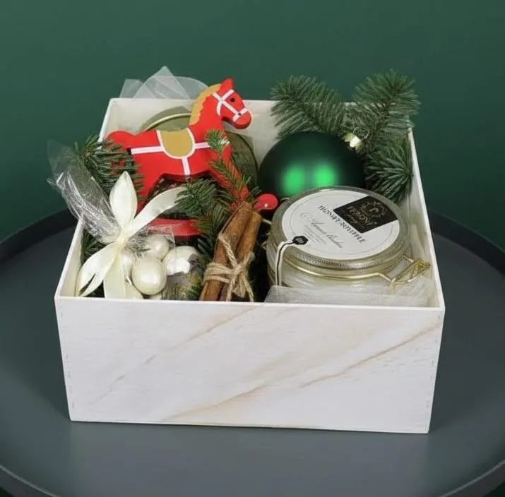 Состав: мед суфле 250 мл, фундук в белом шоколаде 200 гр, корица 3шт, конфеты монпасье в банке, игрушка елочная лошадка, шар елочный зеленый 6 см, датская ель.
