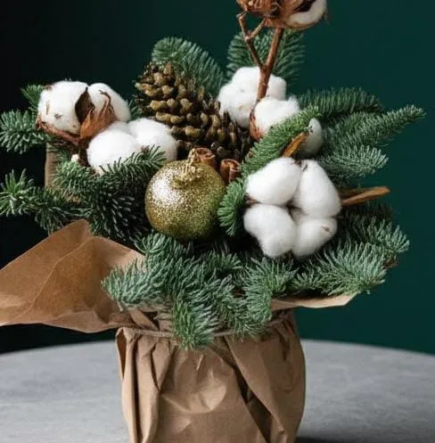 Состав: датская ель, шишка еловая 1 шт, хлопок на ветке 5 бутонов, хлопок 2 бутона, корица 2 шт, шар золото 4 см 1 шт
