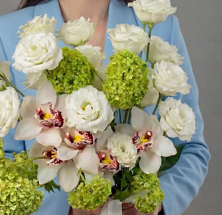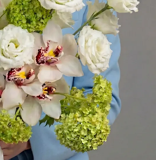 Состав: вибурнум зеленый 3шт, орхидея цимбидиум белая 5шт, лизиантус алиса белый 7шт.