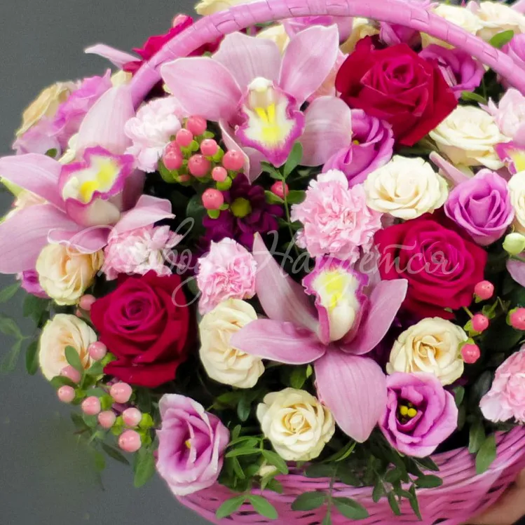 Состав: орхидея цимбидиум темно-розовая 6шт, роза малиновая кения 40 см - 7шт, гиперикум розовый 5шт, диантус кустовой розовый - 4шт, эустома розовая 3шт, бакарди малиновая 2шт, роза кустовая кремовая яна 40 см - 4шт, писташ.