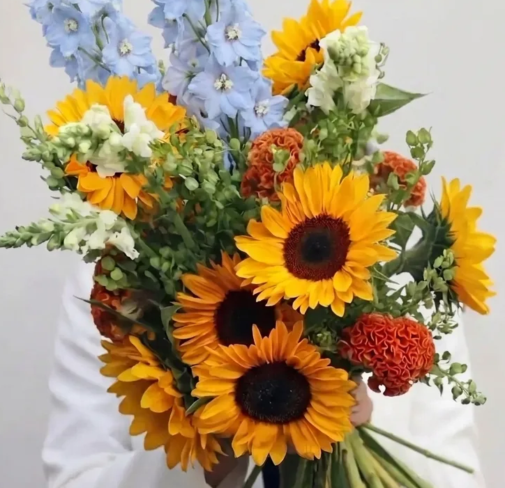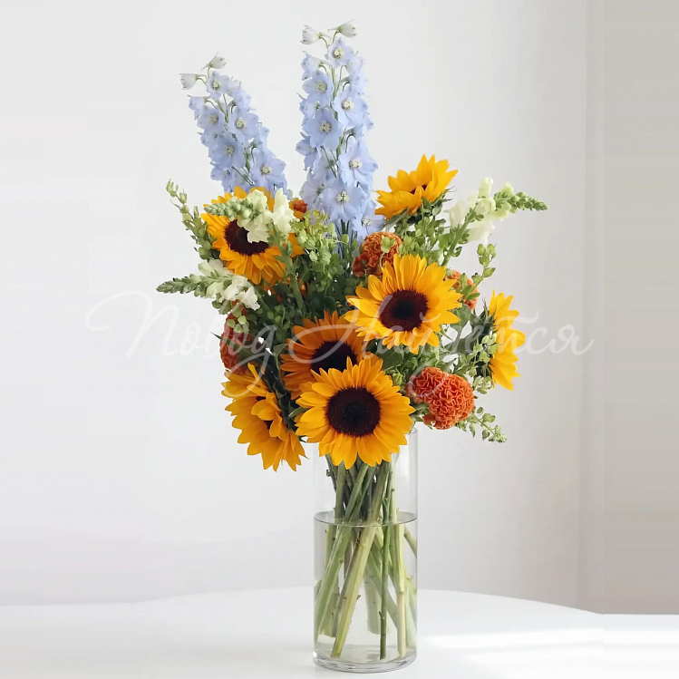 Состав: подсолнух 11шт, дельфиниум голубой - 3шт, антирринум белый 7шт, целлозия оранжевая 5шт, писташ, малина 1 шт.