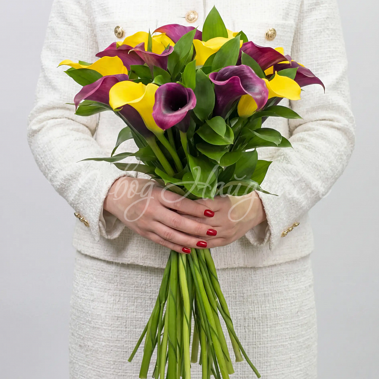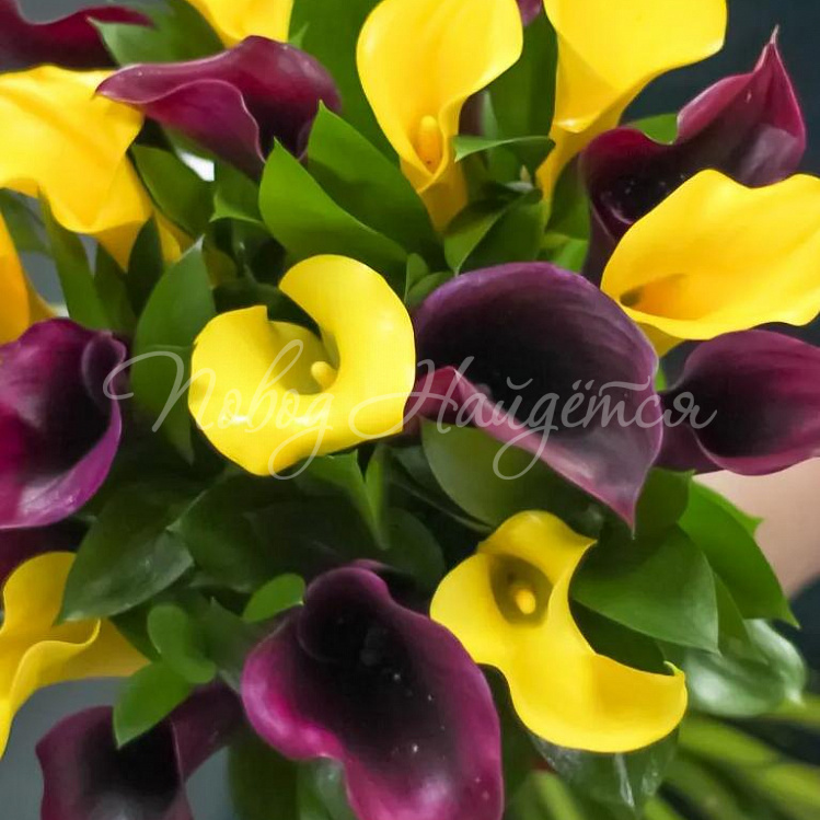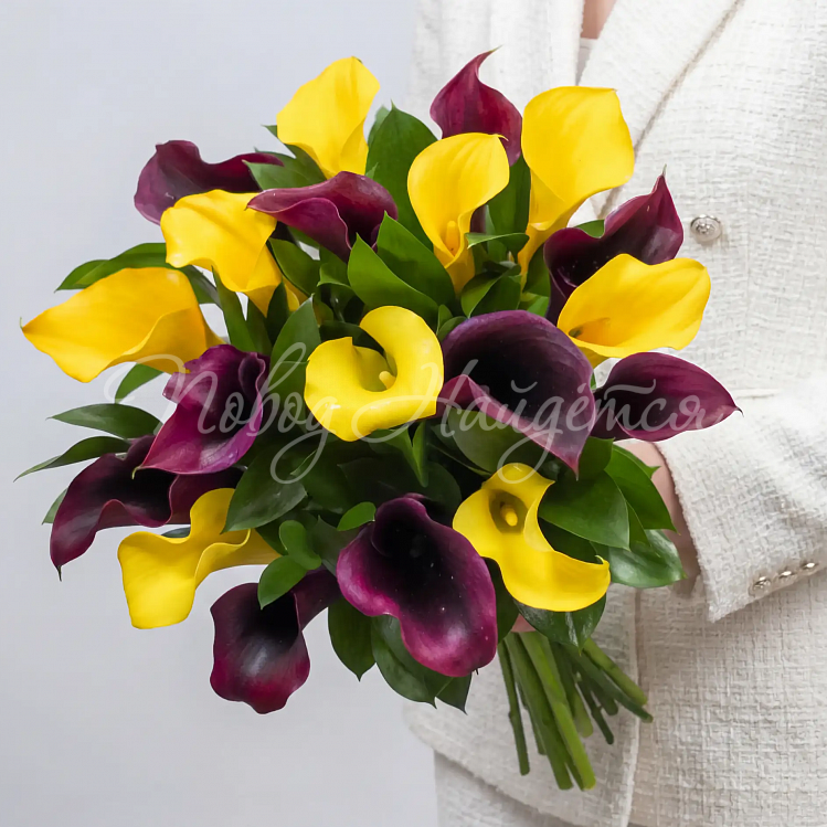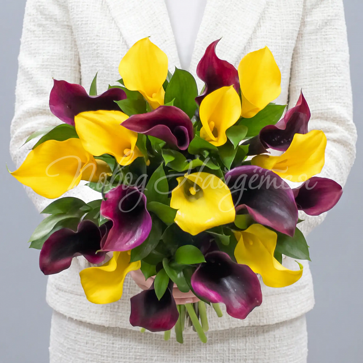 Состав: Каллы желтые - 9 шт. каллы темно-вишневого цвета 10 шт, писташ/салал.