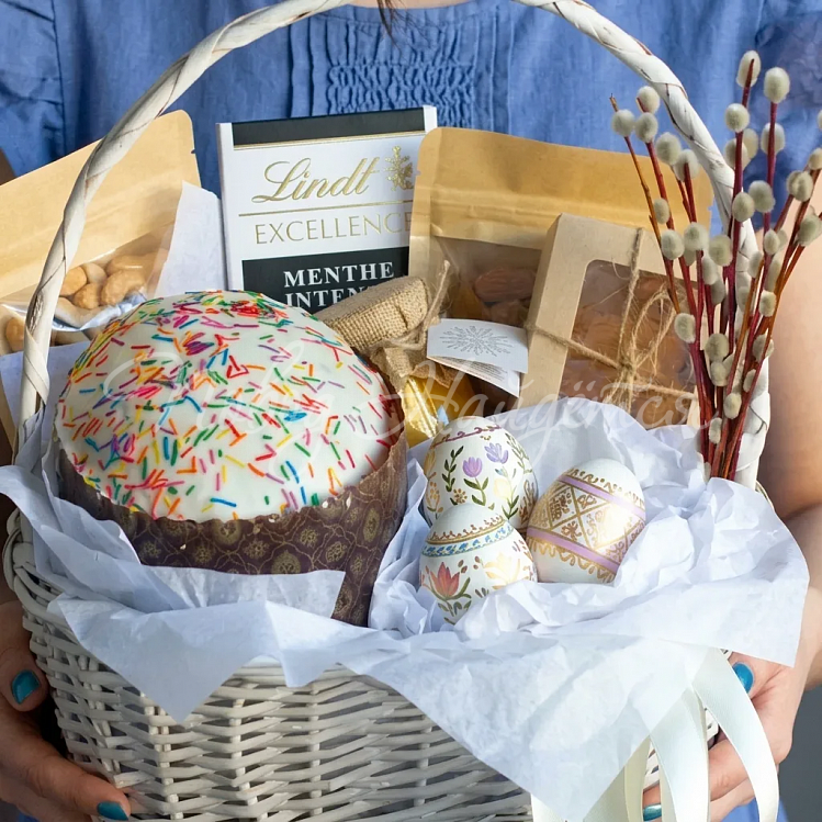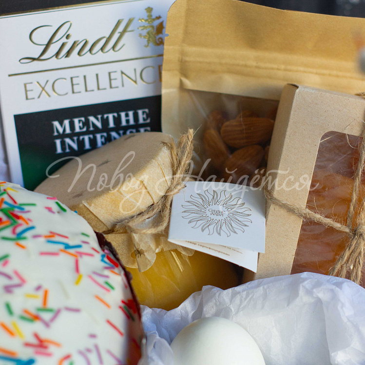 Состав: кулич премиум 1шт, яйца белые "пасхальная тематика" 3шт, шоколад Линд, мед Алтайский, орех Миндаль 100гр, орех Кешью 100гр, коробочка "курага" 100гр, пучок вербы.