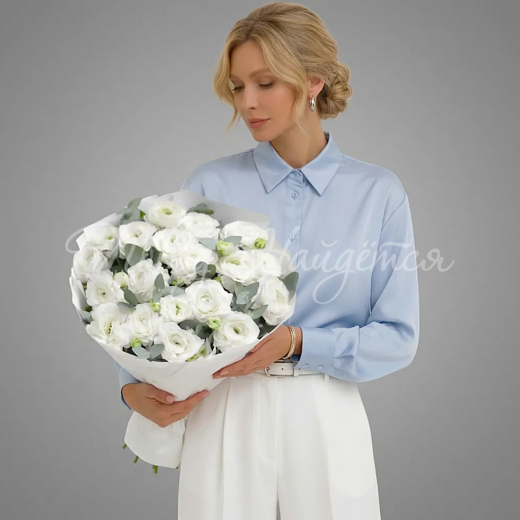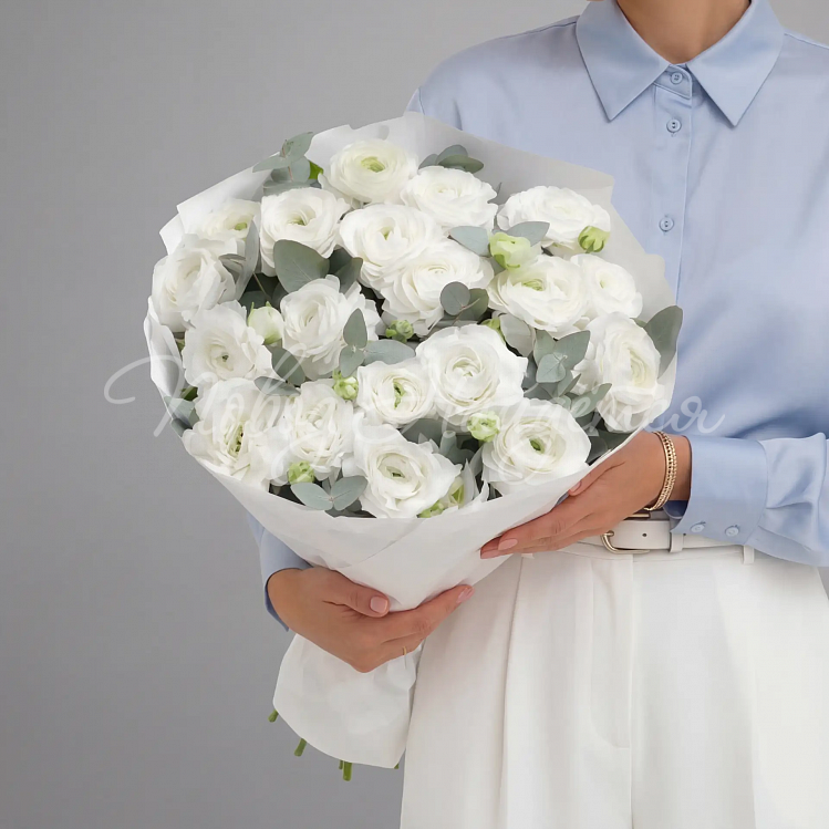 На фото: ранункулюсы белые (голландия) - 19 шт., эвкалипт
