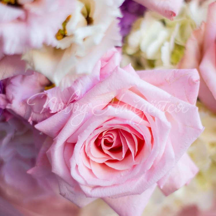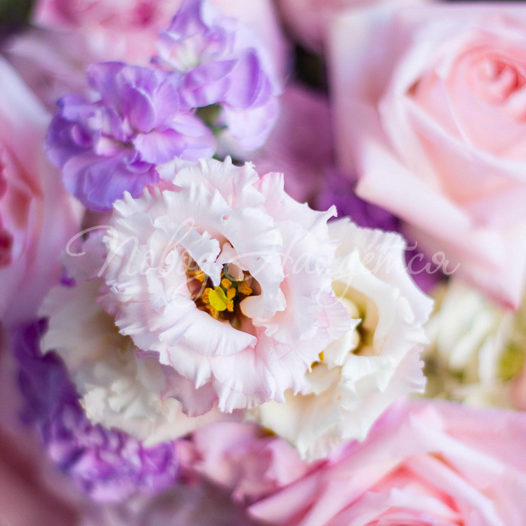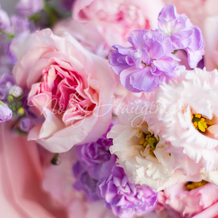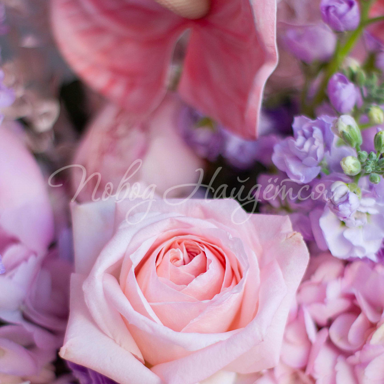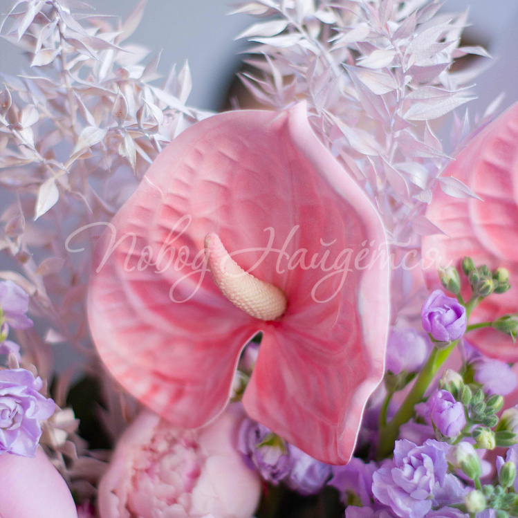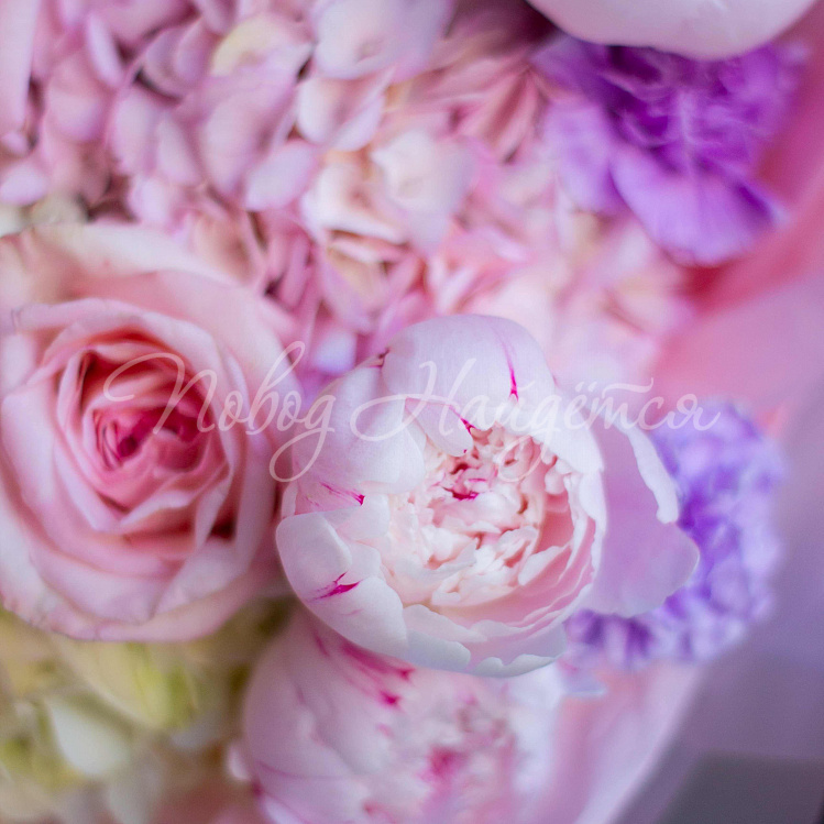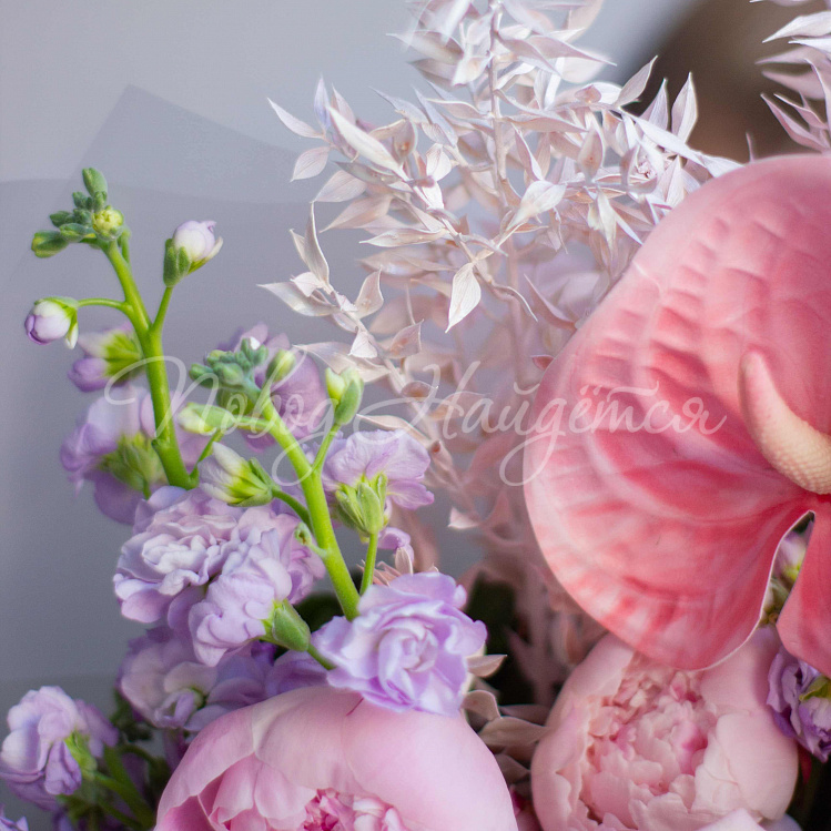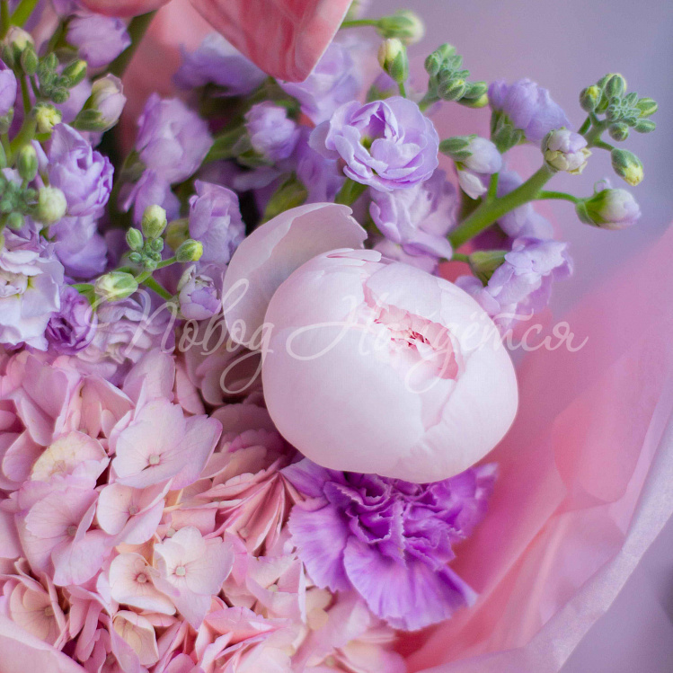 Состав: гортензия розовая 2шт, гортензия белая 1шт, антуриум нежно розовый 2шт, пион сара 5шт, роза пионовидная пинк о хара 4шт, алиса розовая 1шт, матиола лавандовая кустовая 4шт, диантус лунный 5шт, рускус стабилизированный нежно розовый 2шт, писташ.