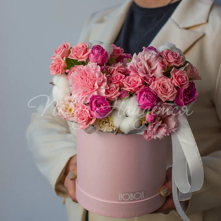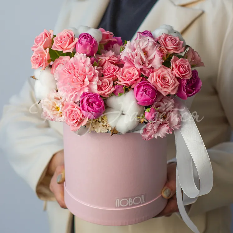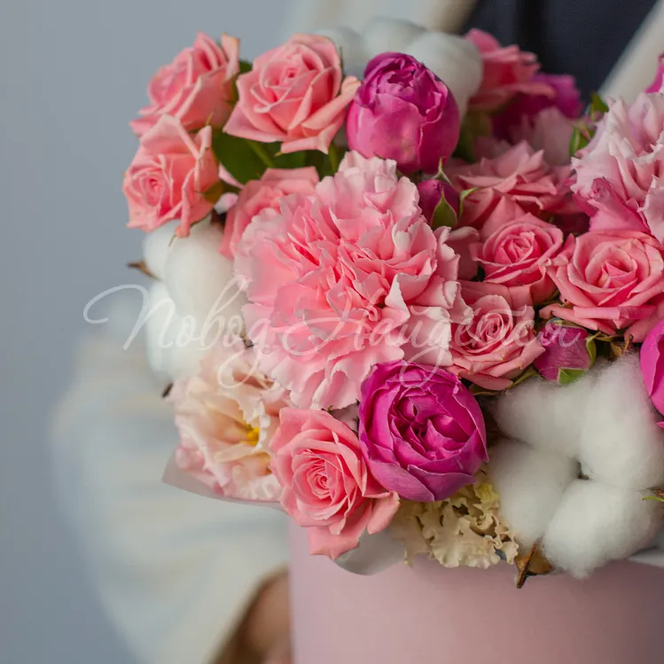 Состав: роза кустовая лидия 5шт, алиса розовая 2шт, роза пионовидная мисти баблз 1, диантус розовый одноголовый 3, хлопок 5.