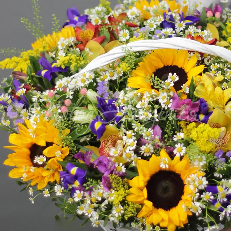 Состав: подсолнух 7 шт, ромашка 15шт, ирис 10шт, орхидея цимбидиум желтый 4шт, альстромерия красная 3шт, альстромерия лавандовая 3шт, альстромерия жетая 2шт, альстромерия малиновая 2шт, гиперикум розовый 3шт, статица лавандовая 2шт, грин бел 2шт, писташ.