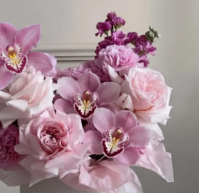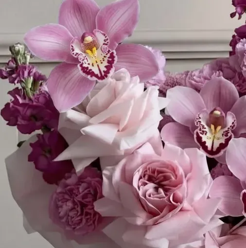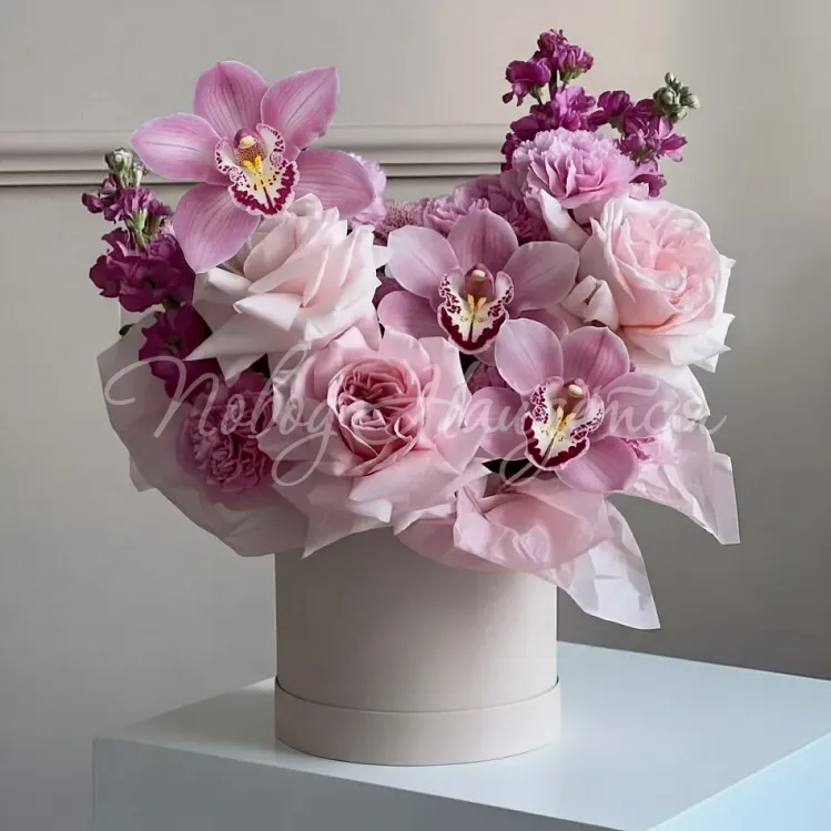 Состав: орхидея цимбидиум розовая 3 шт, роза пинк охара 4 шт, маттиола кустовая малиновая 2 шт, диантус розовый 5 шт, гортензия розовая 1 шт