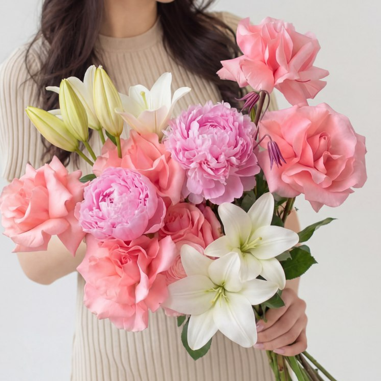 Состав: лилия белая 2шт, роза французская би свиит нежно розовая 6шт, пион нежно розовый сара бернар 2шт, салал 1/4.