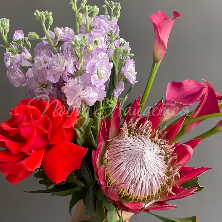 Состав: протея красная 1 шт, маттиола лавандовая кустовая 2 шт. роза французская красная нина 1 шт, калла розовая 6 шт, писташ.