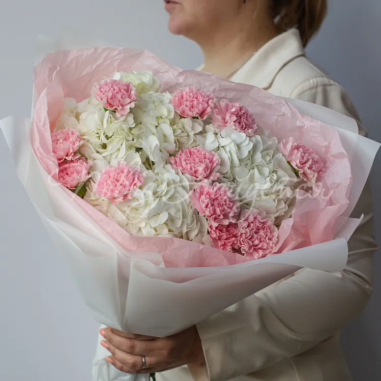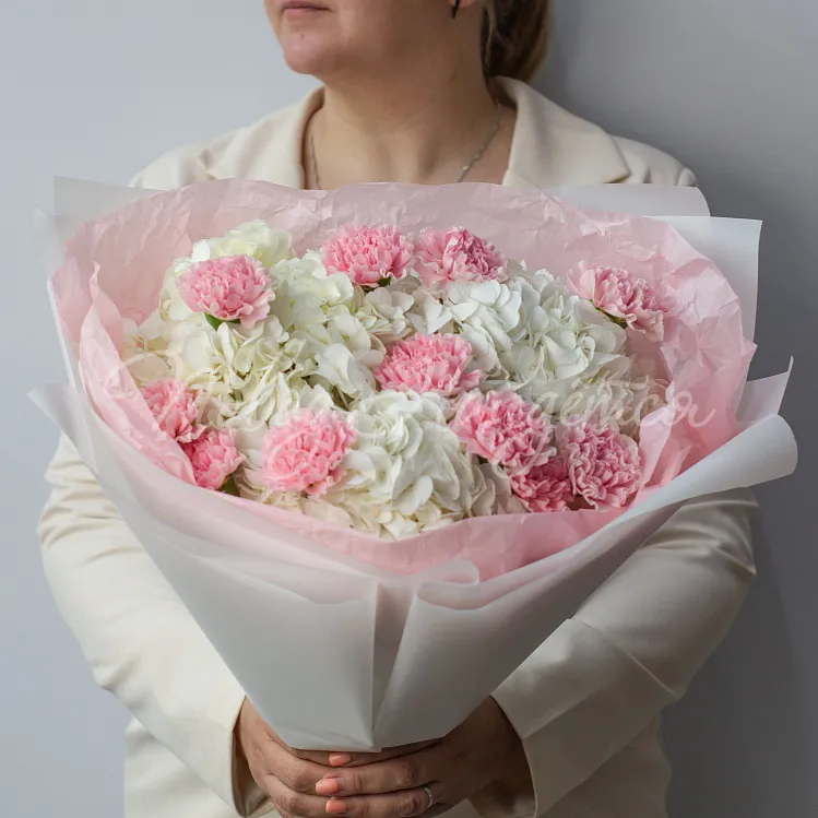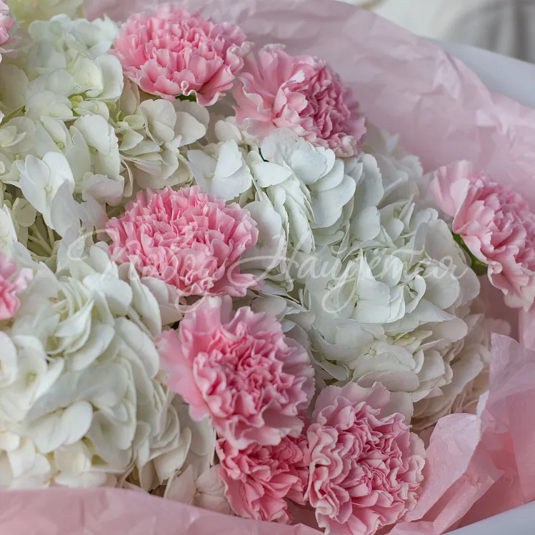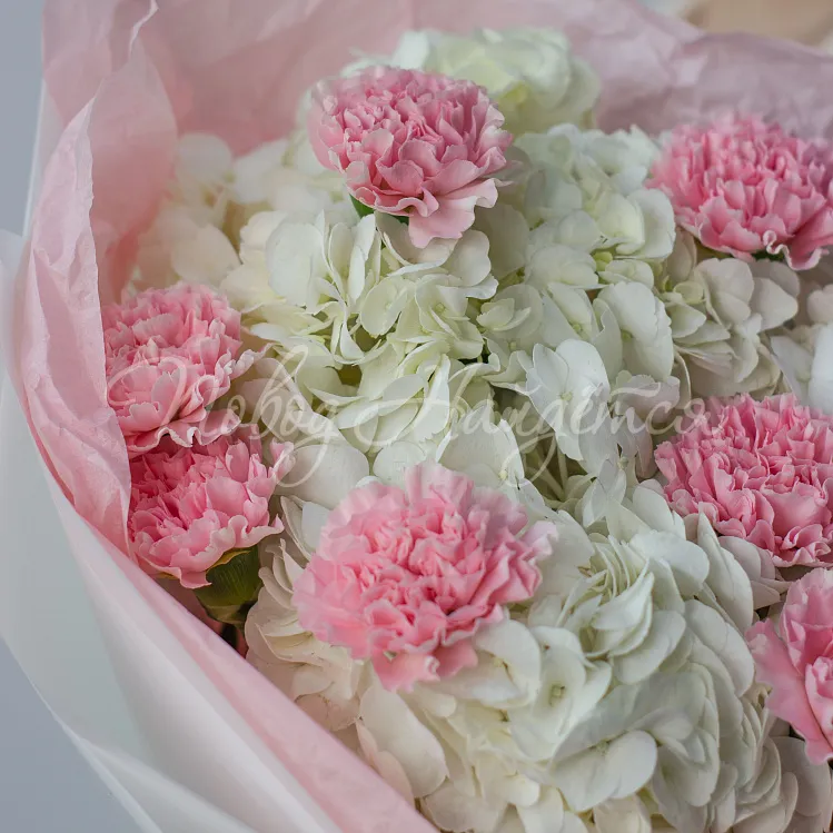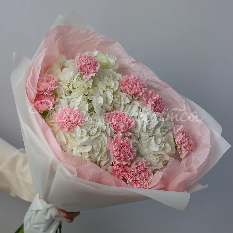 Состав: гортензиями белая кения 3шт, диантус нежно розовый одноголовый - 12 шт.