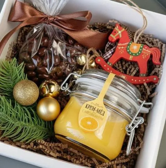 Состав: крем-мед 250 мл, арахис в шоколаде 150 гр, лошадка елочная игрушка, шар золотой 3,5 см 3шт, датская ель.