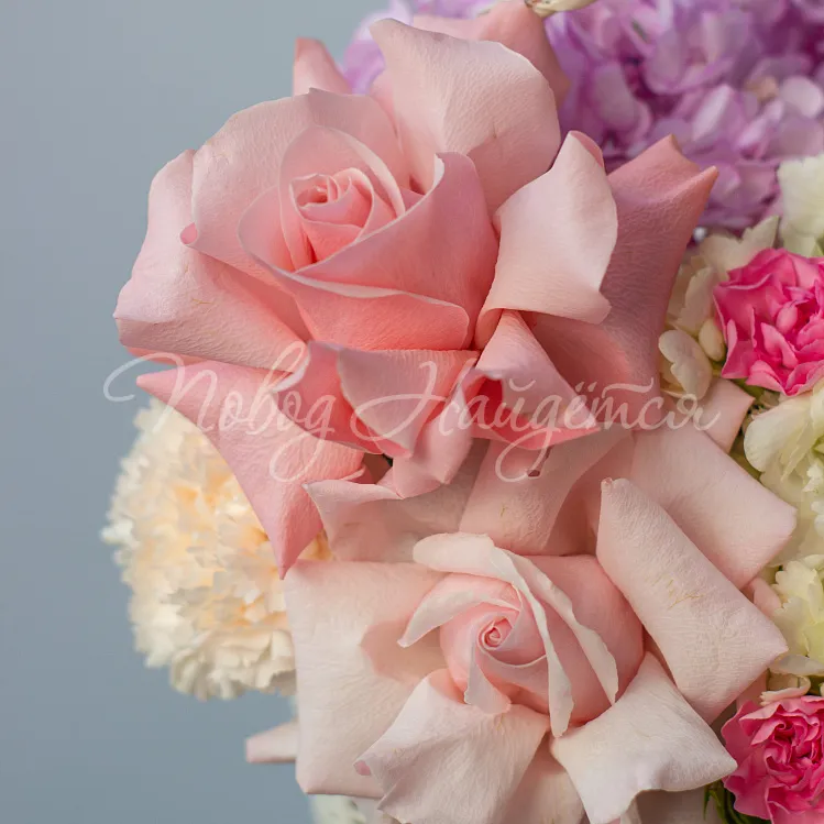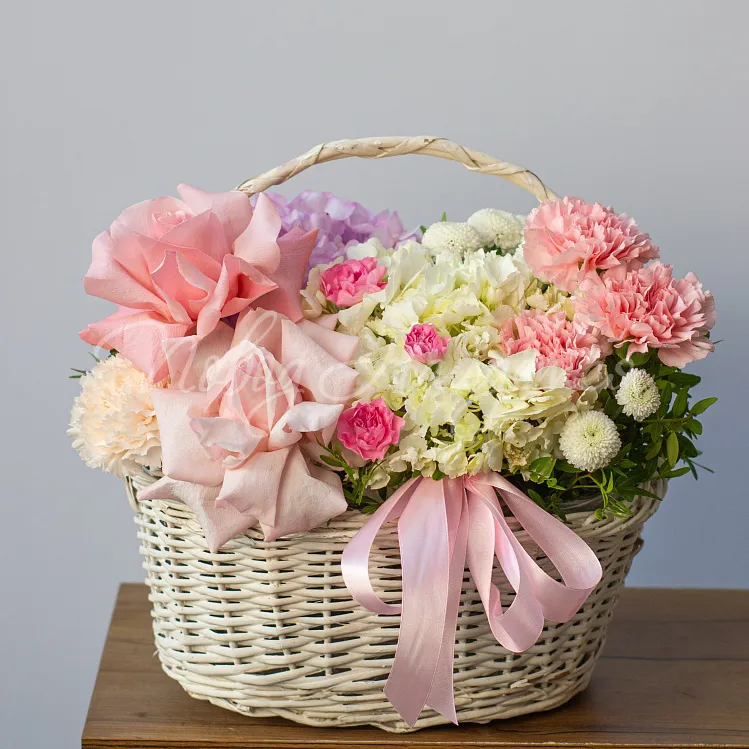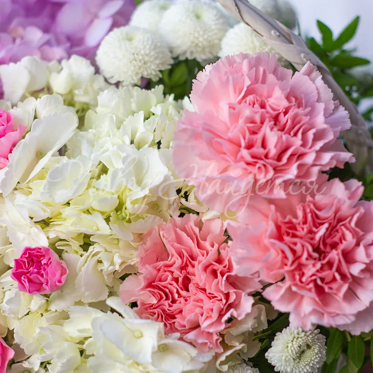 Состав: гортензия кения белая 1шт, гортензия розовая кения 1шт, роза французская 2шт, сантини белая 1шт, диантус розовый одногловый 3шт, диантус розовый кустовой 1шт, диантус белый одкоголовый 1шт, писташ.