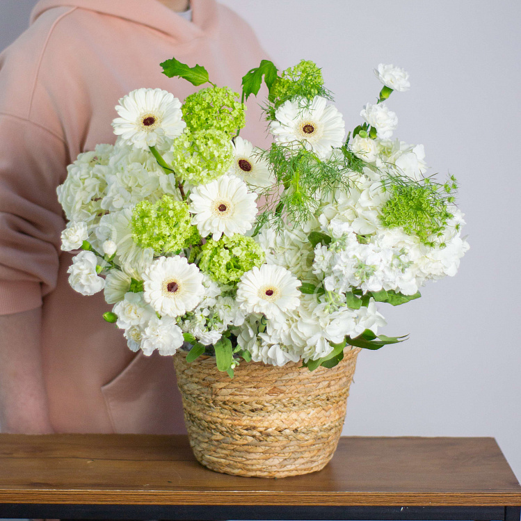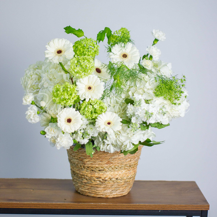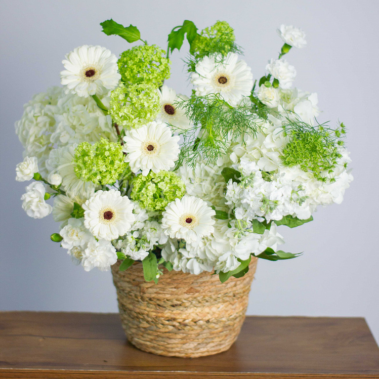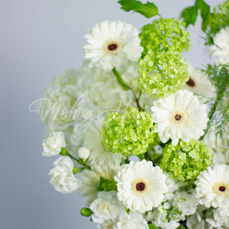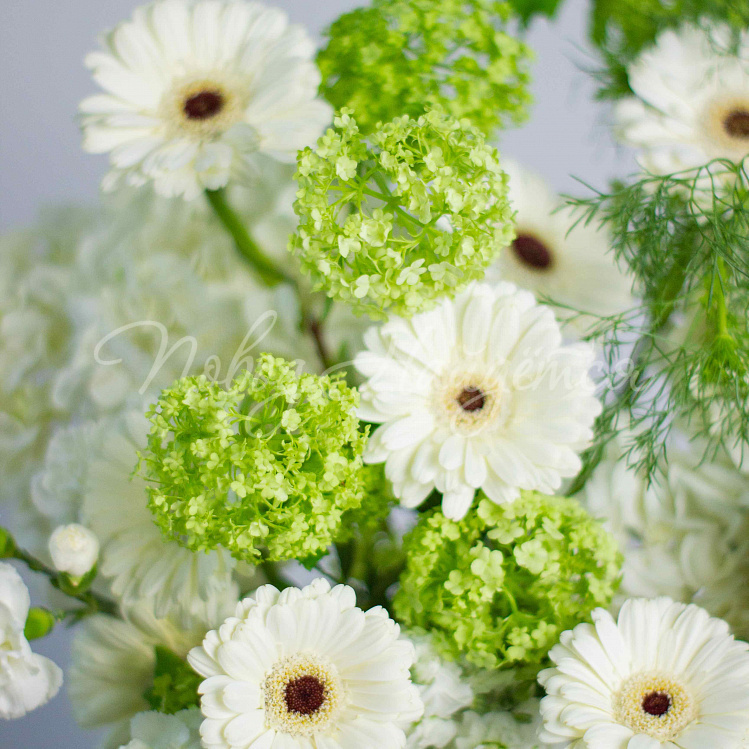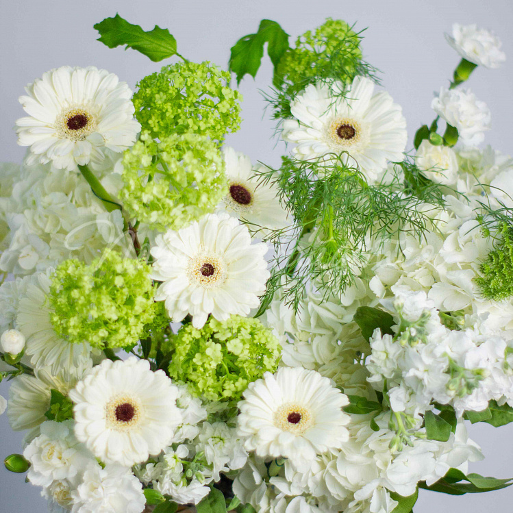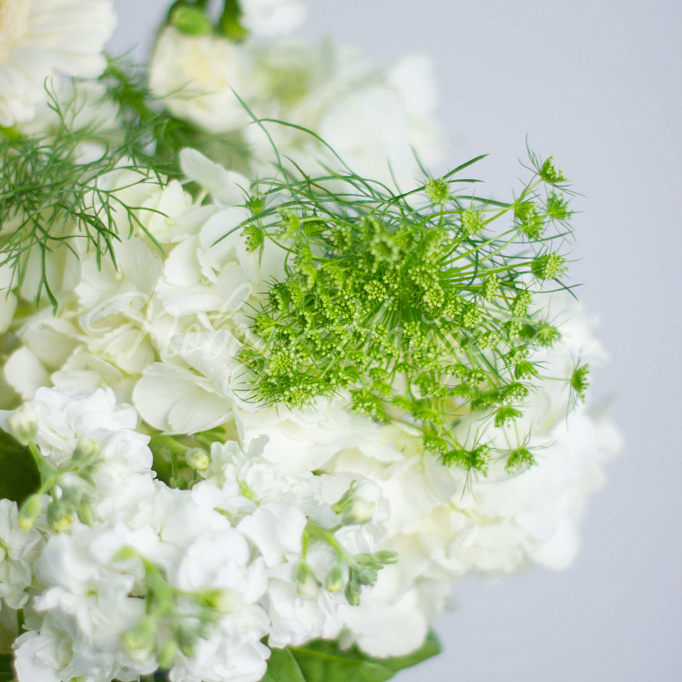 Состав: гортензия белая 5шт, гербера мини белая 10шт, вибурнум зеленый 3шт, матиола белая кустовая 5шт, диантус белый кустовой 6шт, амми 1шт, салал.