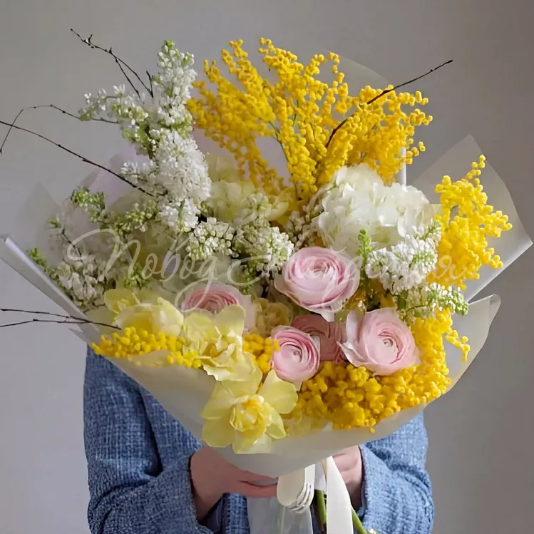 Состав: гортензия белая 3шт, сирень белая 4шт, ранункулюс розовый 5шт, нарцисс желтый одноголовый 7шт, мимоза пучок.