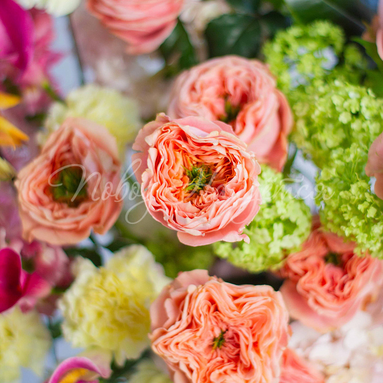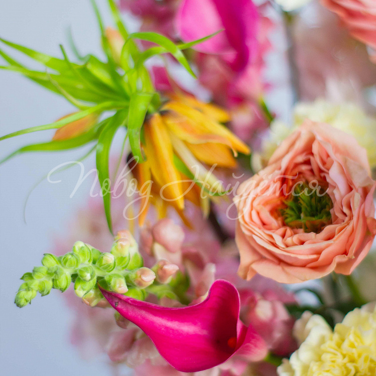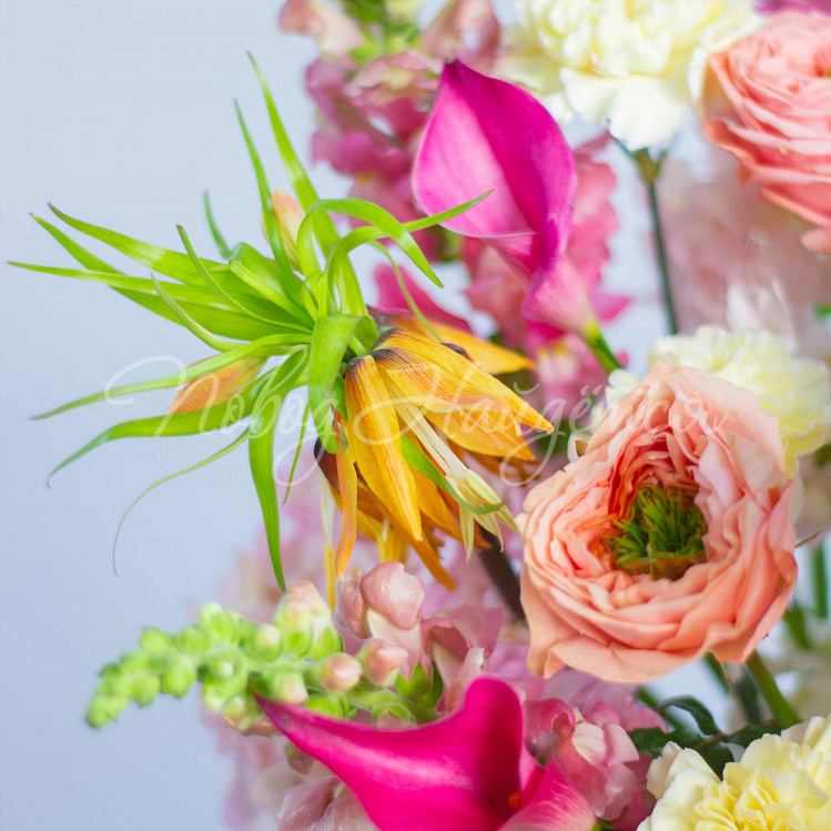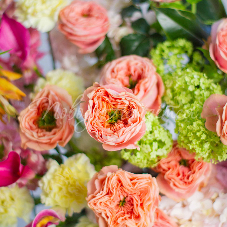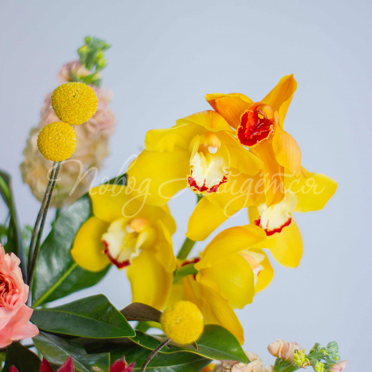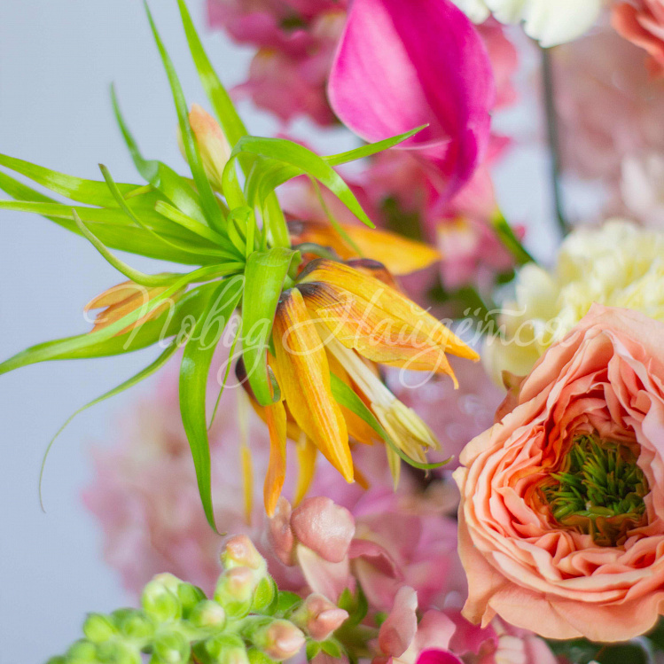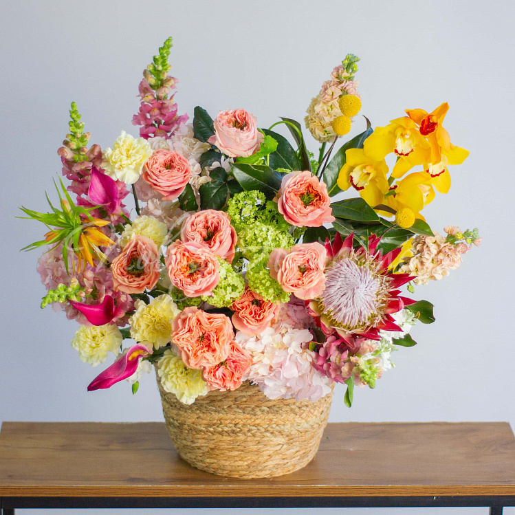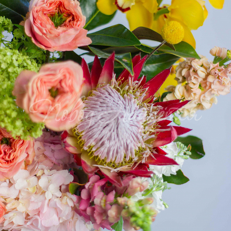 Состав: гортензия розовая 5, протея красная 1 шт, роза пионовидная оранж мандарин 10шт, фритиллярия 1, калла розовая 5шт, орхидея цимбидиум желтая 1 ветка, вибурнум зеленый 3 шт, ветка магнолии 1шт, антиринум розовый 7шт, матиола кремовая 5шт, диантус лимонный 10 шт, краспедия 3шт.