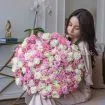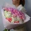 Состав: гортензия белая(кения) 1 шт, орхидея цимбидиум белая 2 шт, роза пинк охара 1 шт, хризантема евро 3 шт, маттиола кустовая белая 3 шт, эустома алиса розовая 3 шт, диантус розовый кустовой 5 шт, эвкалипт 0.3 шт