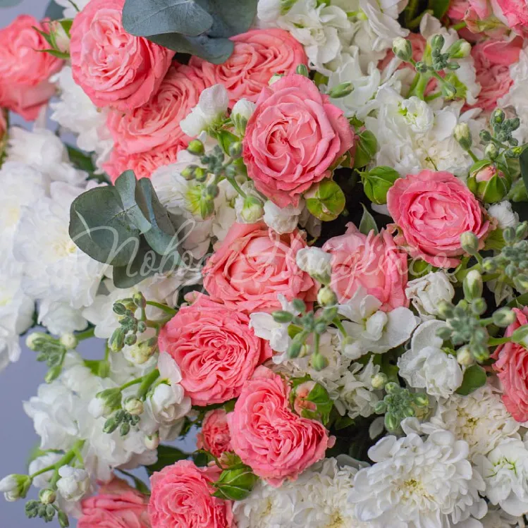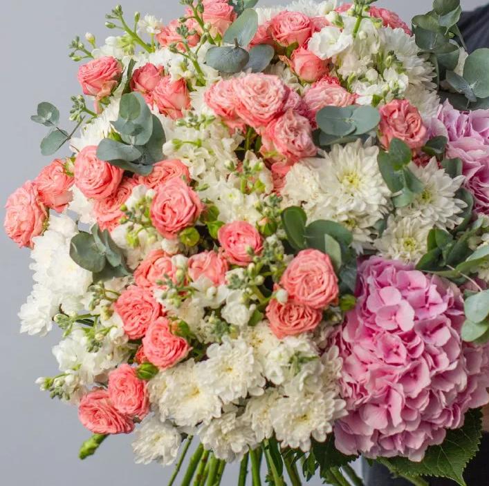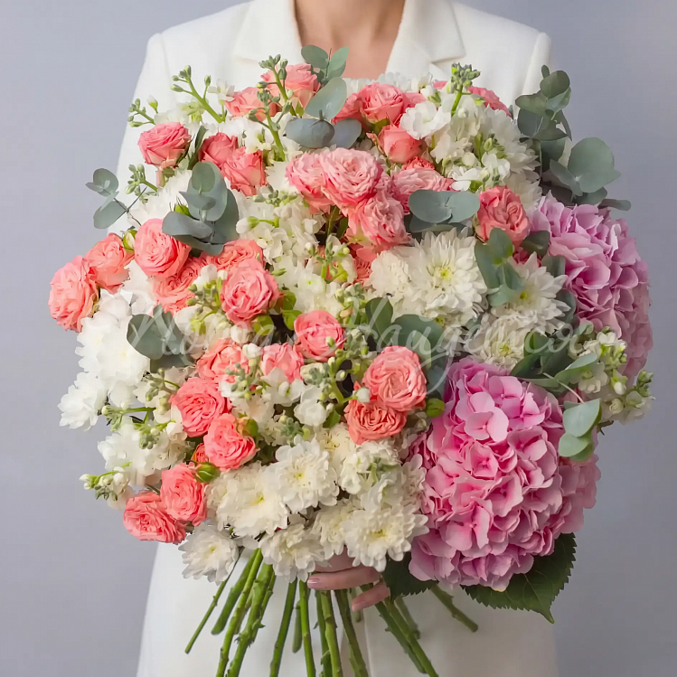Состав: гортензия розовая 2 шт, матиола белая кустовая 10 шт, роза кустовая пионовидная бомбастик 6 шт, хризантема евро белая 15 шт,эвкалипт, писташ
