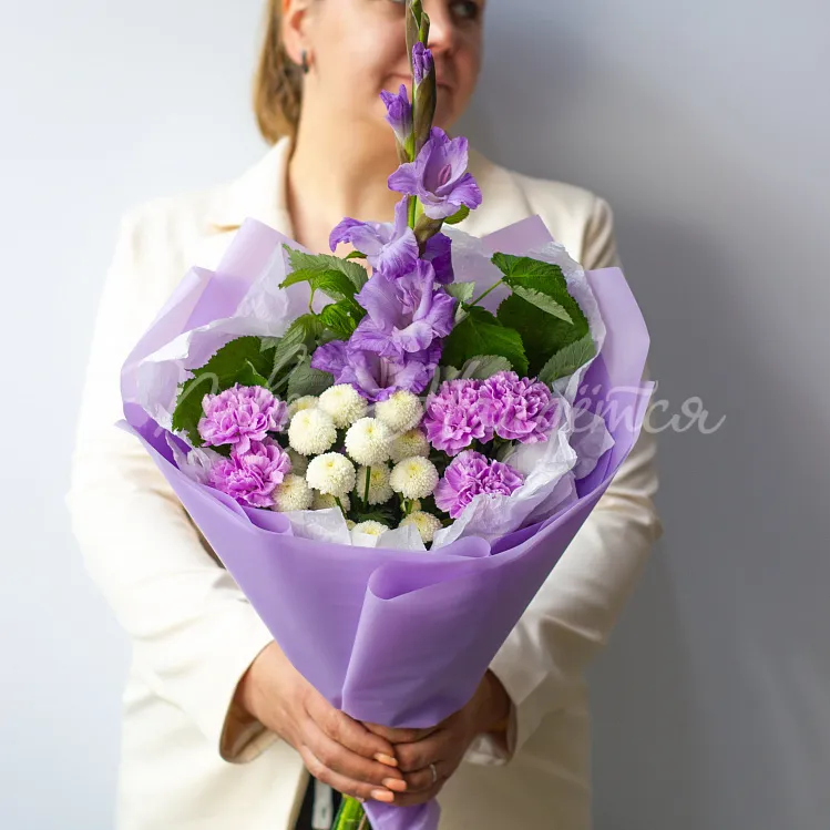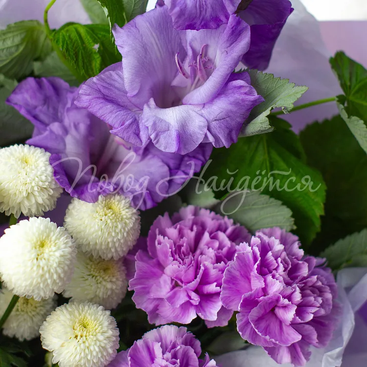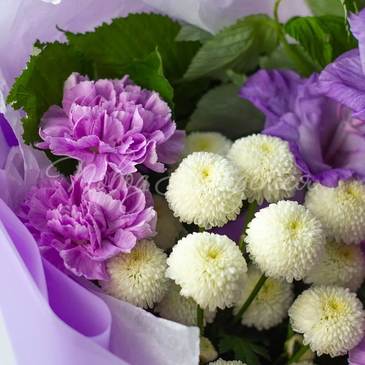 Состав: гладиолус лавандовый 1шт, сантини белая 1шт, диантус лунный 5шт, малина ветка 1шт, писташ.