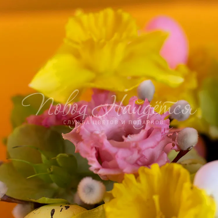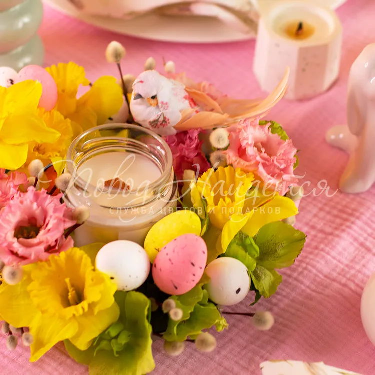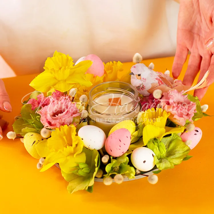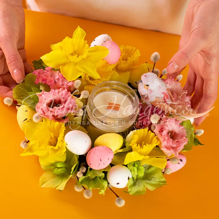 Состав: ароматическая свеча 1 шт, эустома алиса розовая 1шт, нарцисс одноголовый 5 шт, хелеборус 0.2 пучка, верба 1\2 пучка, яйца декор 9 шт, птичка декор 1 шт