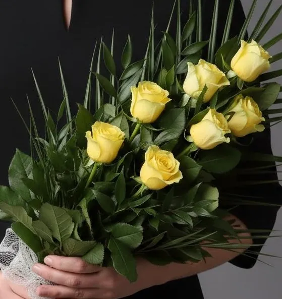 Состав: роза желтая 50 см 6шт, рускус 2шт, салал 1/4, листа пальмы 1шт, аралия 1шт.