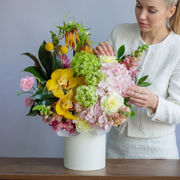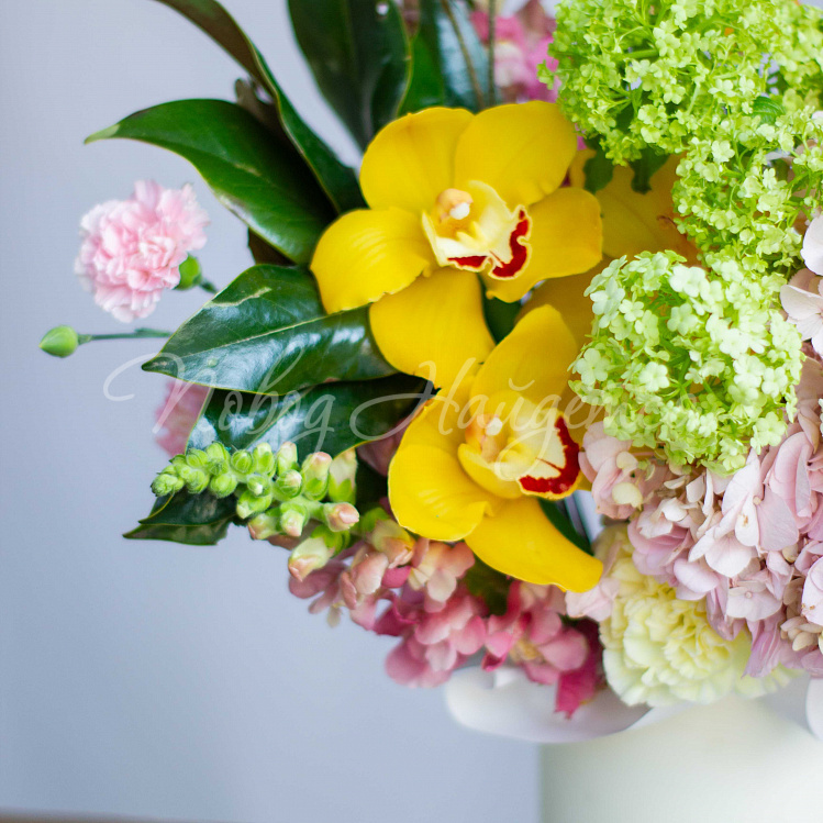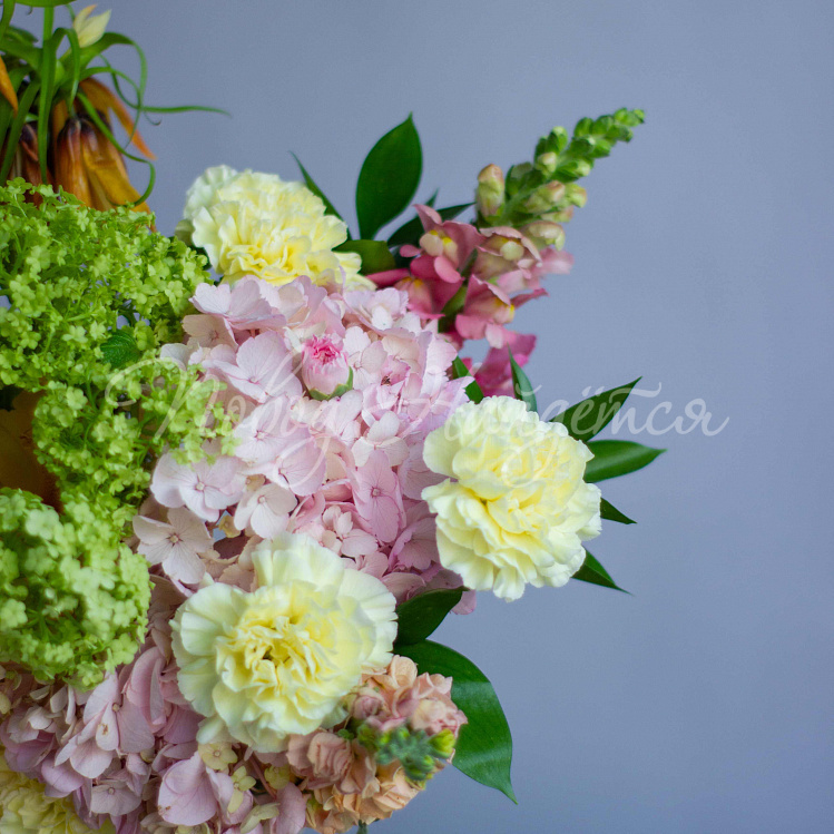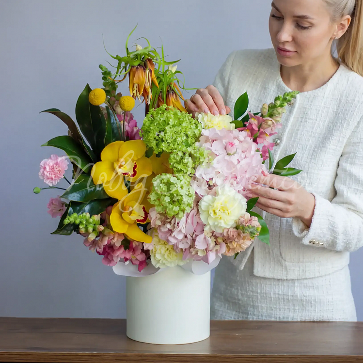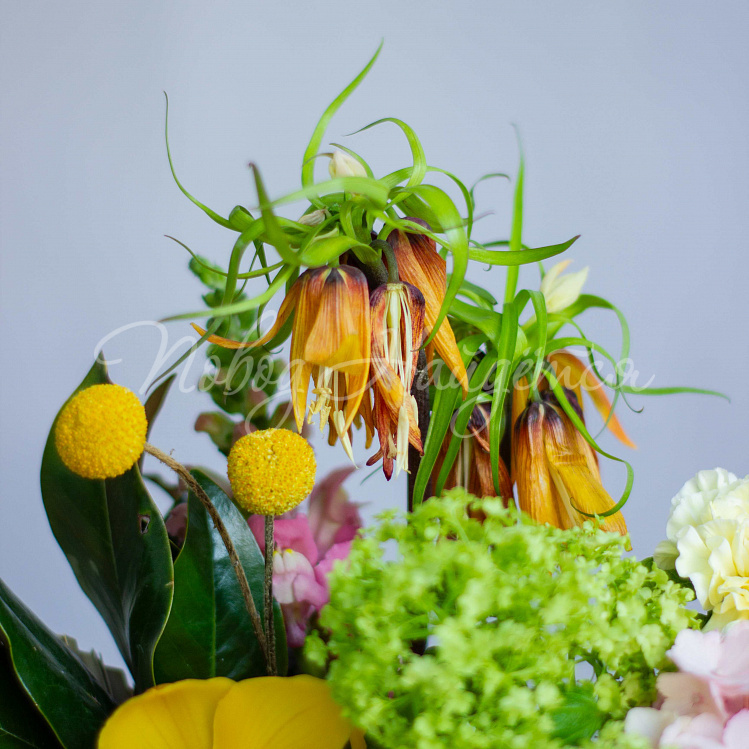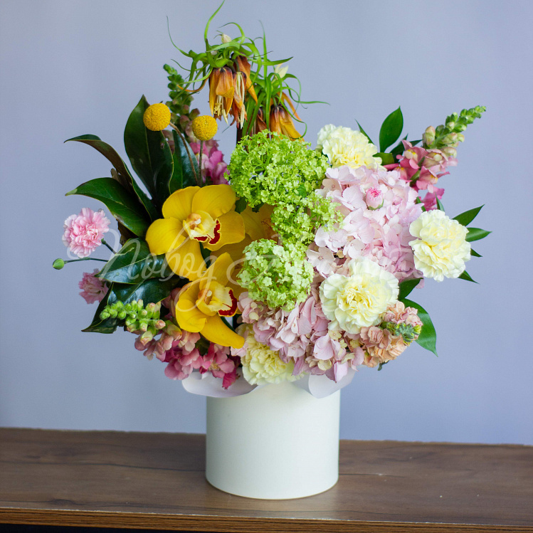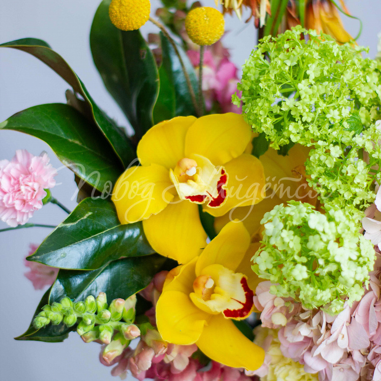 Состав: фритиллярия 2шт, гортензия розовая 3шт, вибурнум зеленый 2шт, ветка магнолии 1шт, цимбидиум желтый 5шт, диантус лимонный 7шт, краспедия 2шт, антиринум розовый 4шт, диантус розовый кустовой 1шт, рускус 7шт.