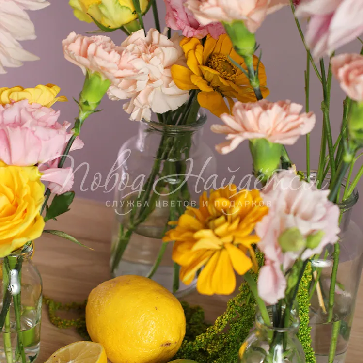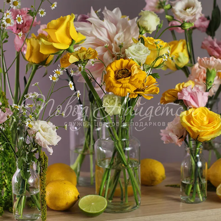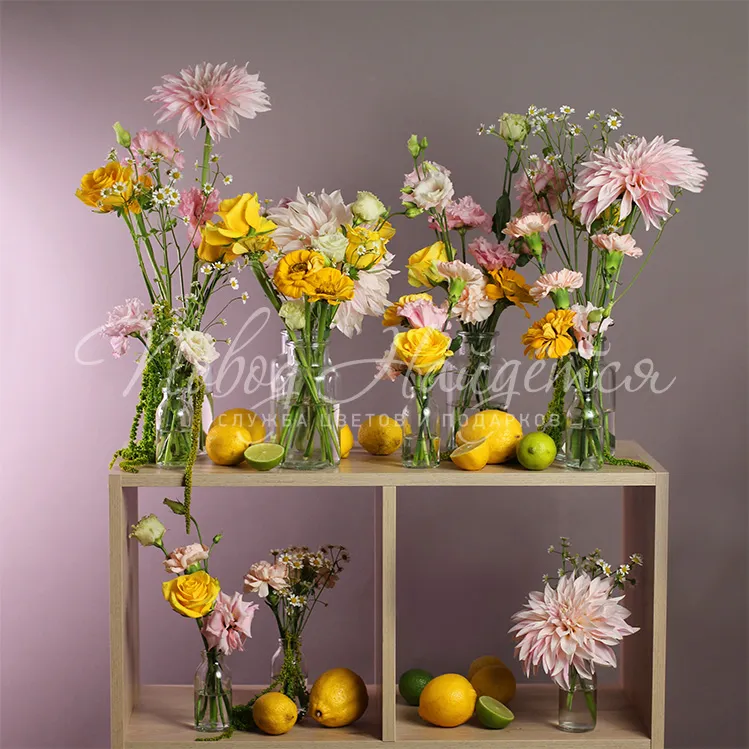 Состав: георгин нежно розовый игольчатый 5шт, алиса розовая 4шт, роза желтая илиос 6шт, гвоздика нежно-розовая кустовая 3шт, циния 10шт, танацетум 5шт, амарант 1 ветка, лимон 10шт, лайм 3шт.