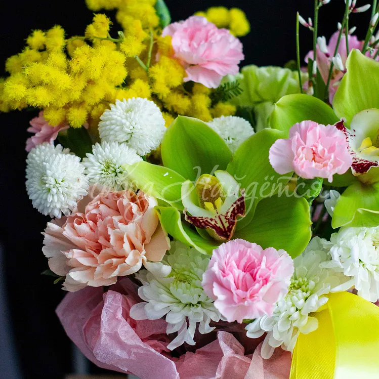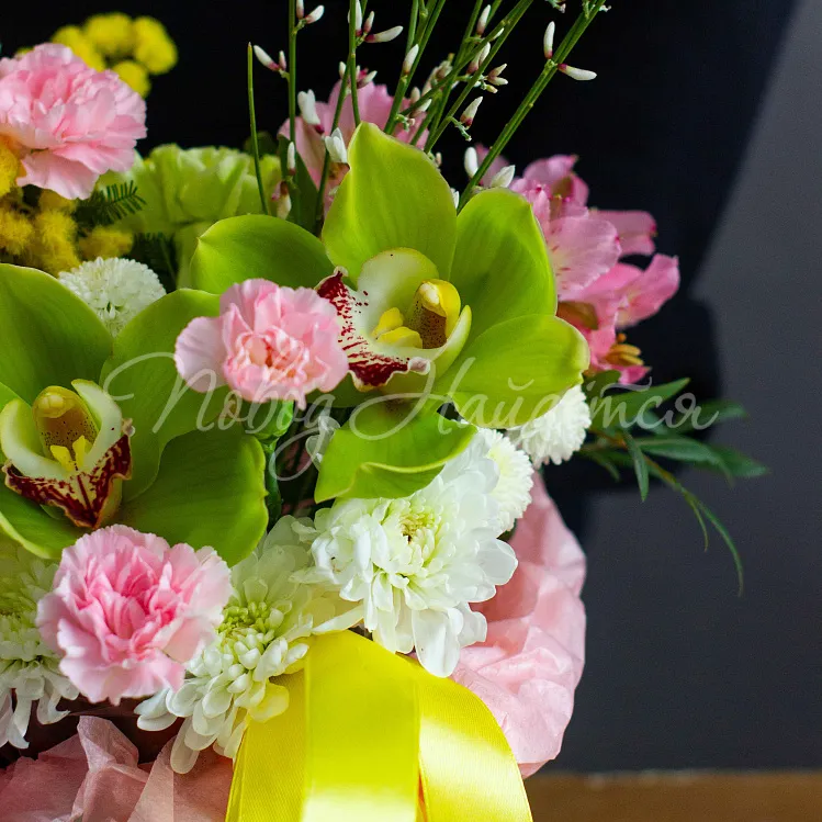 Состав: орхидея цимбидиум зеленая 2шт, альстромерия розовая 1шт, сантини белая 1шт, хризантема евро белая 1шт, диантус кремовый 1шт, диантус зеленый 1шт, диантус розовый кустовой 1шт, мимоза 1шт, гениста 1 шт.