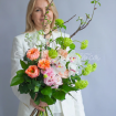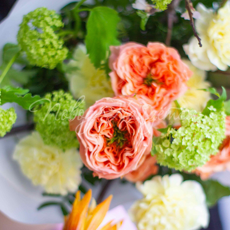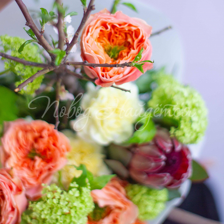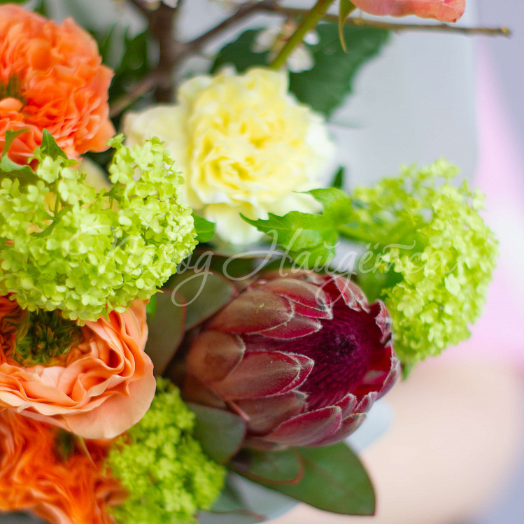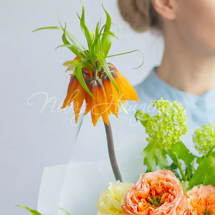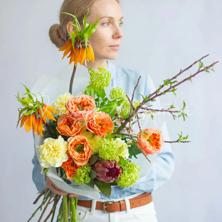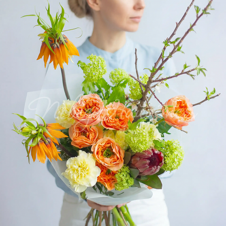 Состав: фритиллярия 2шт, вибурнум зеленый 2шт, протея красная 1шт, роза пионовидная оранж мандарин 6шт, диантус лимонный 5шт, ветки плодовые 2шт, писташ.