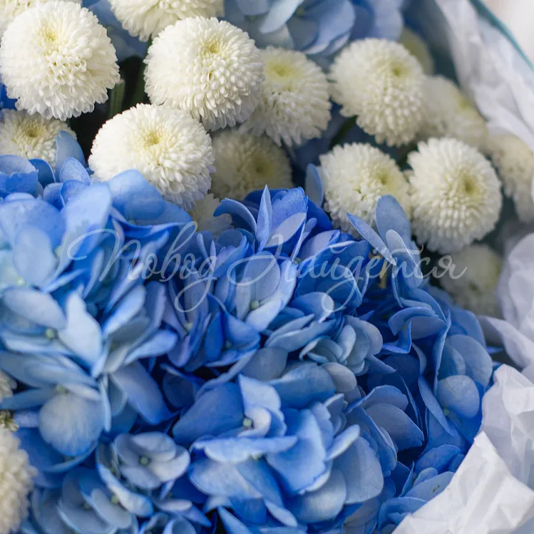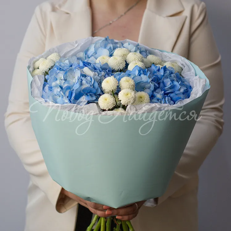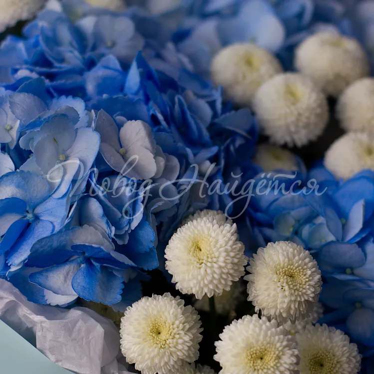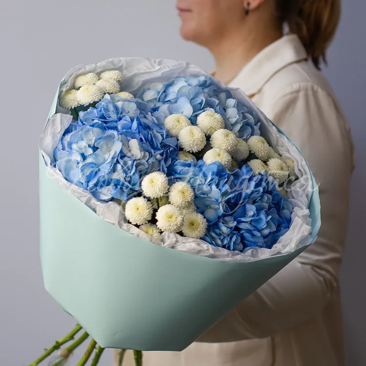 Состав: гортензия голубая кения 3шт, хризантема сантини 4шт, писташ.