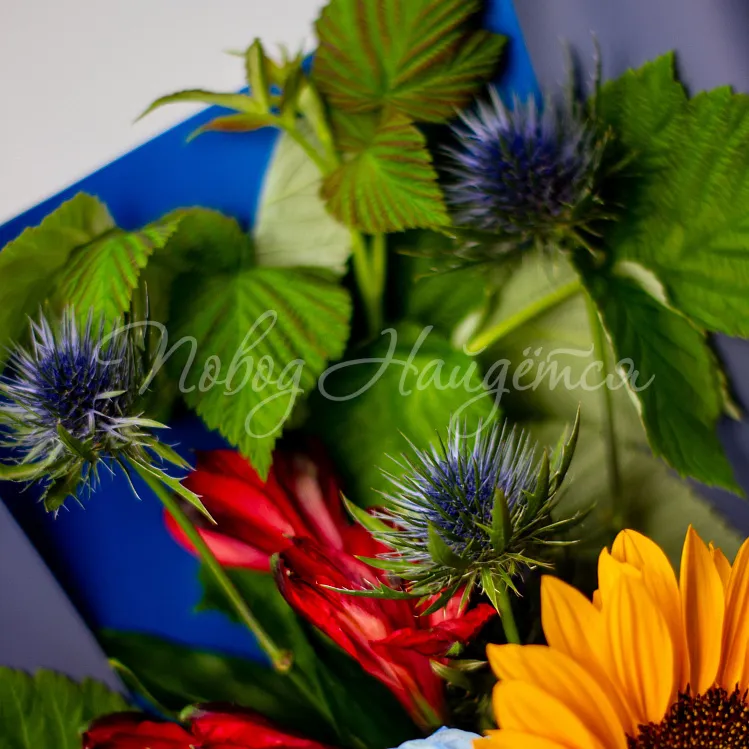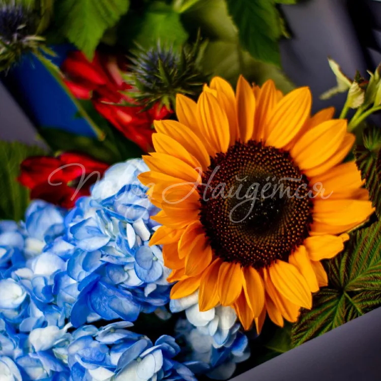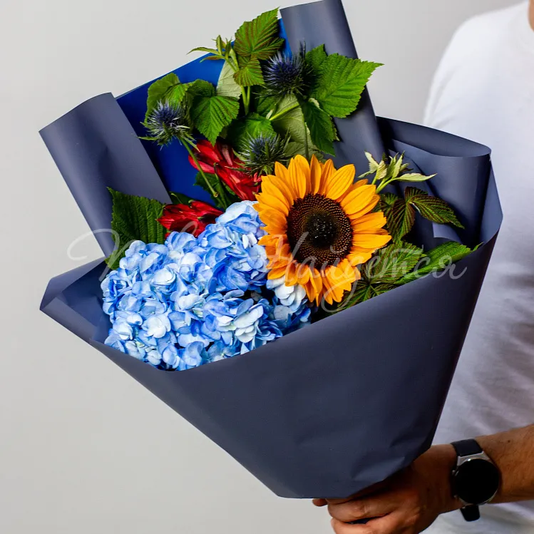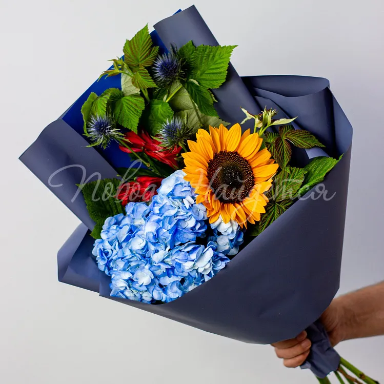Состав: Состав: гортензия голубая 1 шт, подсолнух 1 шт, альстромерия красная 1 шт, эрингиум 1 шт, листья малины 2 шт, писташ 1