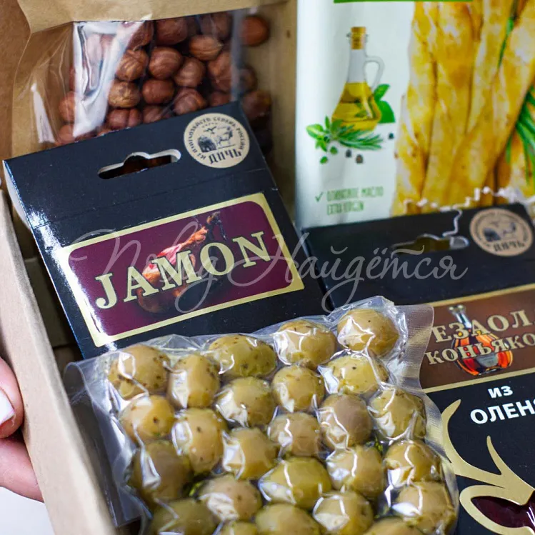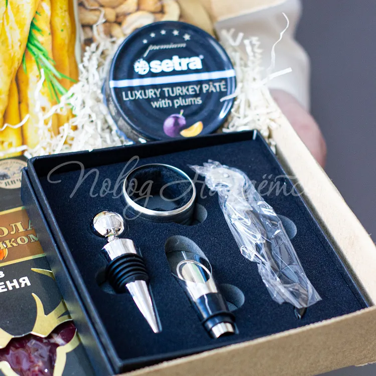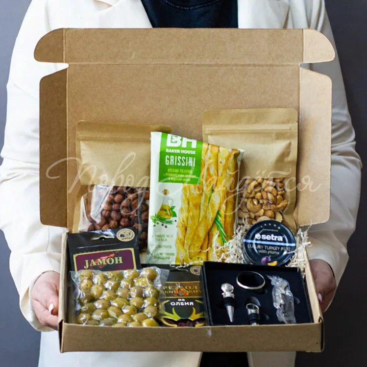 Состав: набор для вина, паштет из утки, хамон, брезаола с коньяком, оливки вакуум, гриссини, орехи кешью, орехи фундук.