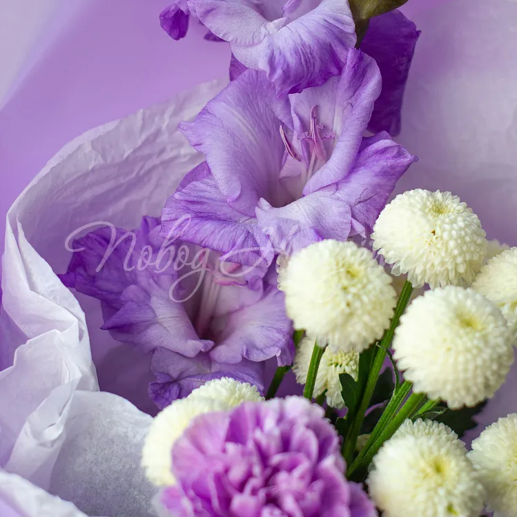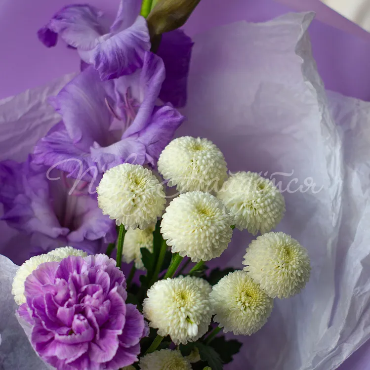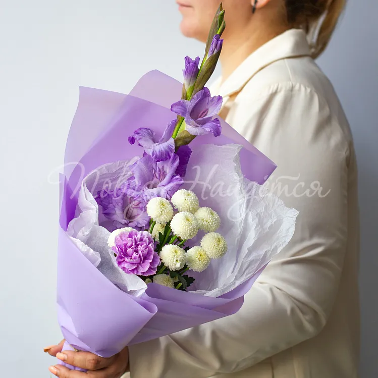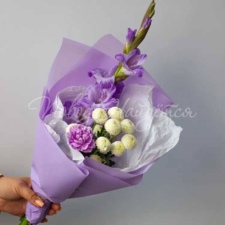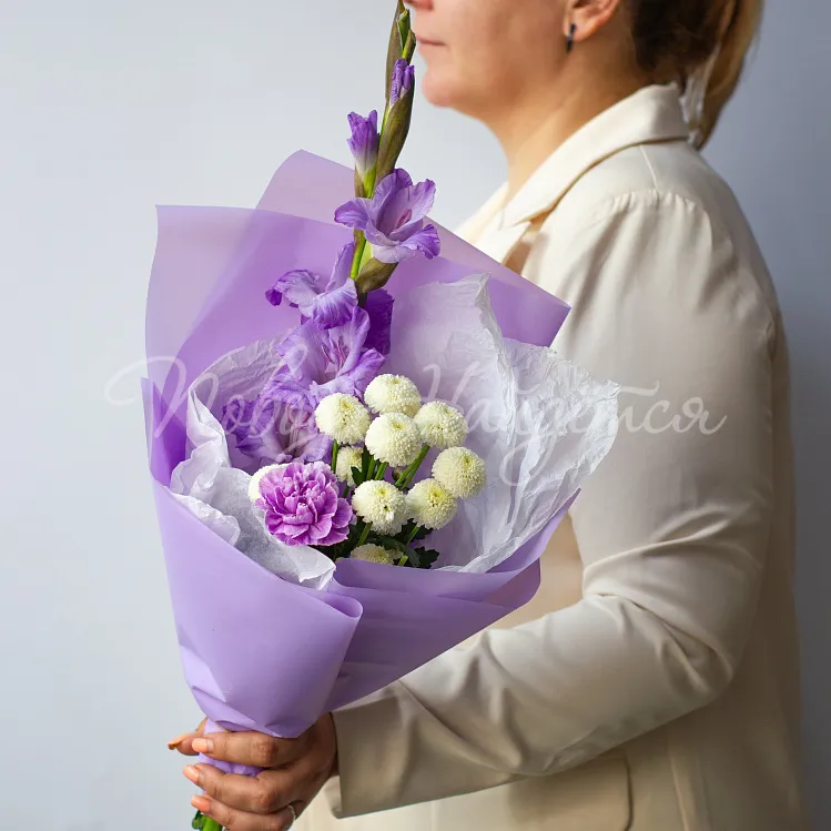 Состав: гладиолус лавандовый 1шт, сантини белая 1шт, диантус лунный 1шт.